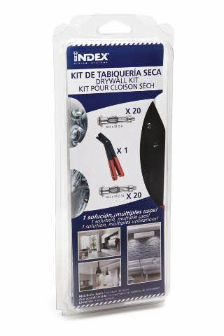 Packs de bricolage. Cheville Indemoll pour fixation dans matériaux creux Kit pour cloison sèch ( 1 uds.) Revêtement: zingué. Utilisation recommandée sur: placo-prâtre, béton creuse, brique creuse... entre autres. Recommandé pour l'installation de collier lampe, climatisation, fixation extincteur, placard cuisine, tableau, fluorescent, lampe de plafond, tableau... entre autres. (Ref: KITINPIN01, EAN: 8423533747587, INDEX Fixing Systems)