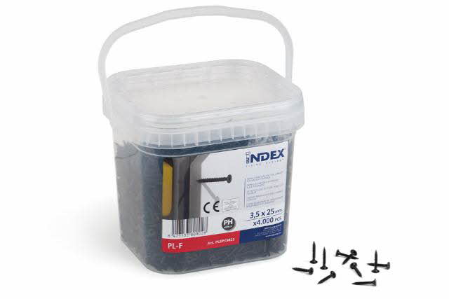 Packs de bricolage. Vis pour cloisons sèches, tête trompette, double filetage, vis pointue Boîte plasqique (3,5 x 25 1 uds.) Revêtement: phosphaté.Produit homologué CE Utilisation recommandée sur: placo-prâtre... entre autres. Recommandé pour l'installation de bâtiment béton en construction... entre autres. (Ref: PLEP35025, EAN: 8423533447333, INDEX Fixing Systems)