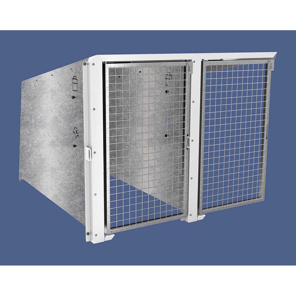 Portes : grillage carré fil de Ø 5 mm soudé sur un cadre, finition acier galva ou peint sur galva. Verrouillage de la porte par cadenas (non fourni). Ouverture et fermeture des portes à l’aide d’un vérin
