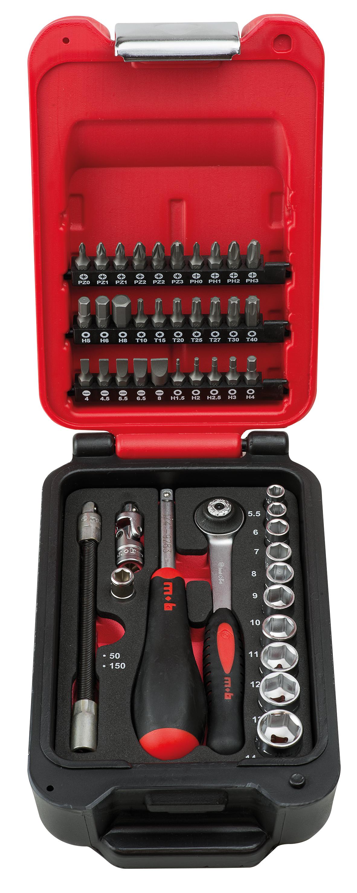10 douilles 6 pans : 5,5/6/7/8/9/10/11/12/13/14mm // 1 cliquet Premium rond // 1 cardan // 1 rallonge : 150 mm flexible // 1 rallonge : 50 mm // 1 poignée tournevis // 1 douille porte-embouts // 30 embouts variés : 5 Fentes : 4/4,5/5,5/6,5/8 mm / 4 Phillips : PH0/PH1/PH2/PH3 / 6 Pozidriv : PZ0/2xPZ1/2xPZ2/PZ3 / 7 Torx : T10/T15/T20/T25/T27/T30/T40 / 8 Hexagonaux : H1,5/H2/H2,5/H3/H4/H5/H6/H8