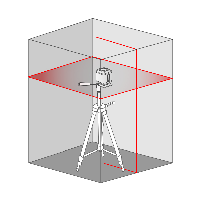 Projette : un plan horizontal sur 360° plus un plan vertical à 90° formant 1 croix de mur (lasers rouges)