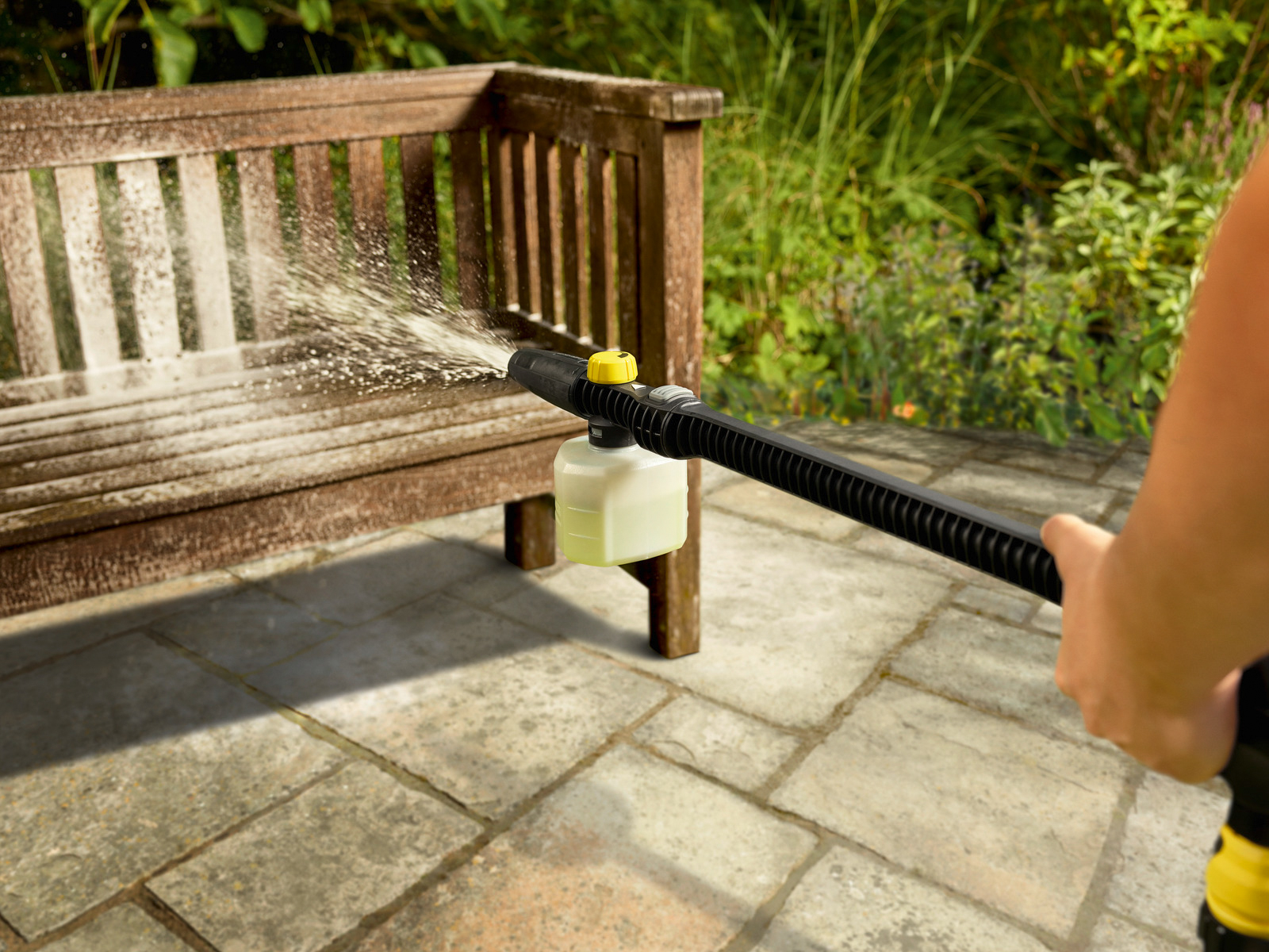 Il suffit de remplir le réservoir de 0,3 litre avec du détergent Home & Garden, de fixer le pulvérisateur à mousse à l'extension et de commencer : grâce à la mousse qui assure un nettoyage en profondeur et au niveau de jet rotatif selon les besoins, toutes les tâches de nettoyage sont maintenant faciles