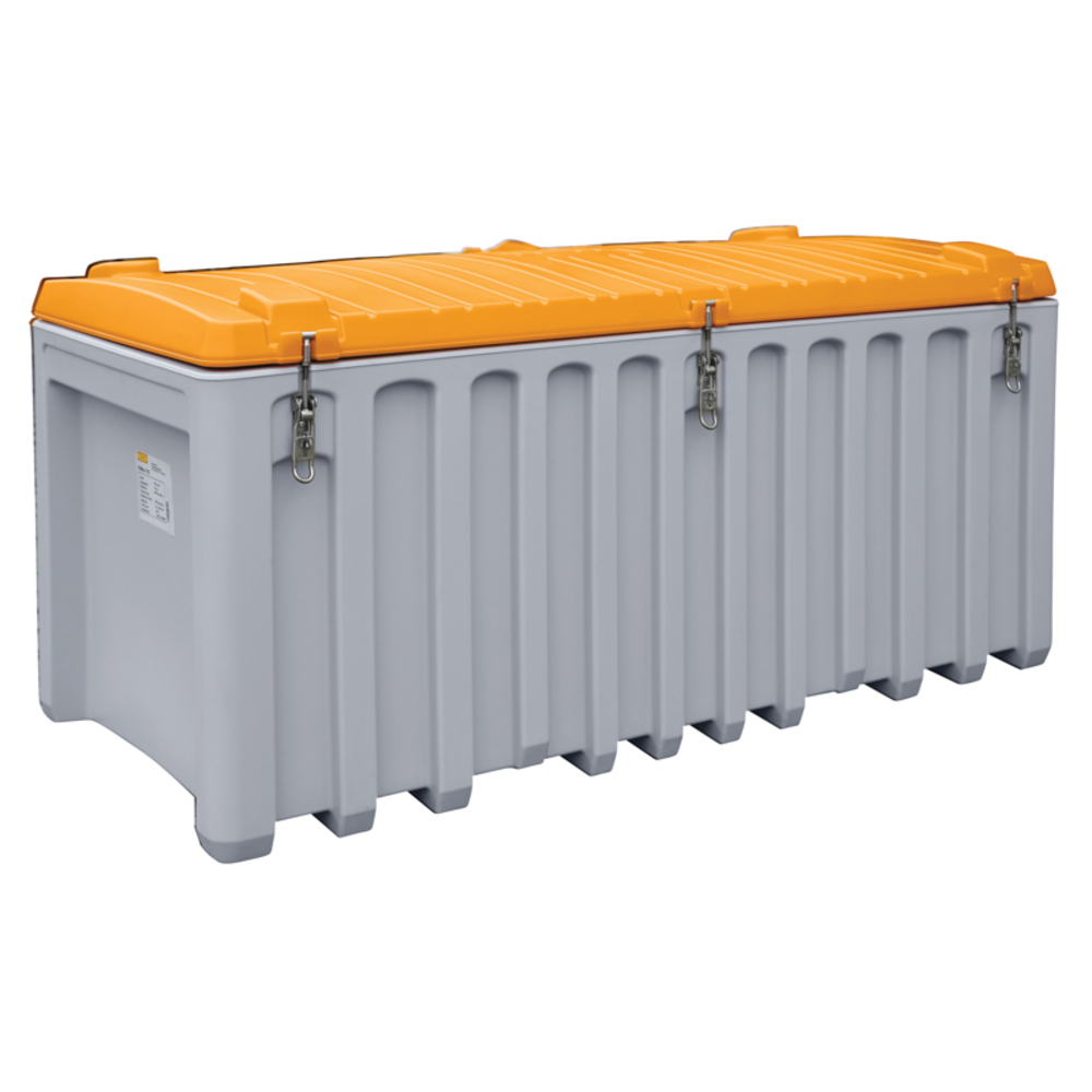 Le coffre est fabriqué en polyéthylène avec une épaisseur moyenne de 4 mm, assurant une conception robuste adaptée au stockage de vrac. Le couvercle dispose d’un joint d’étanchéité pour une protection renforcée.