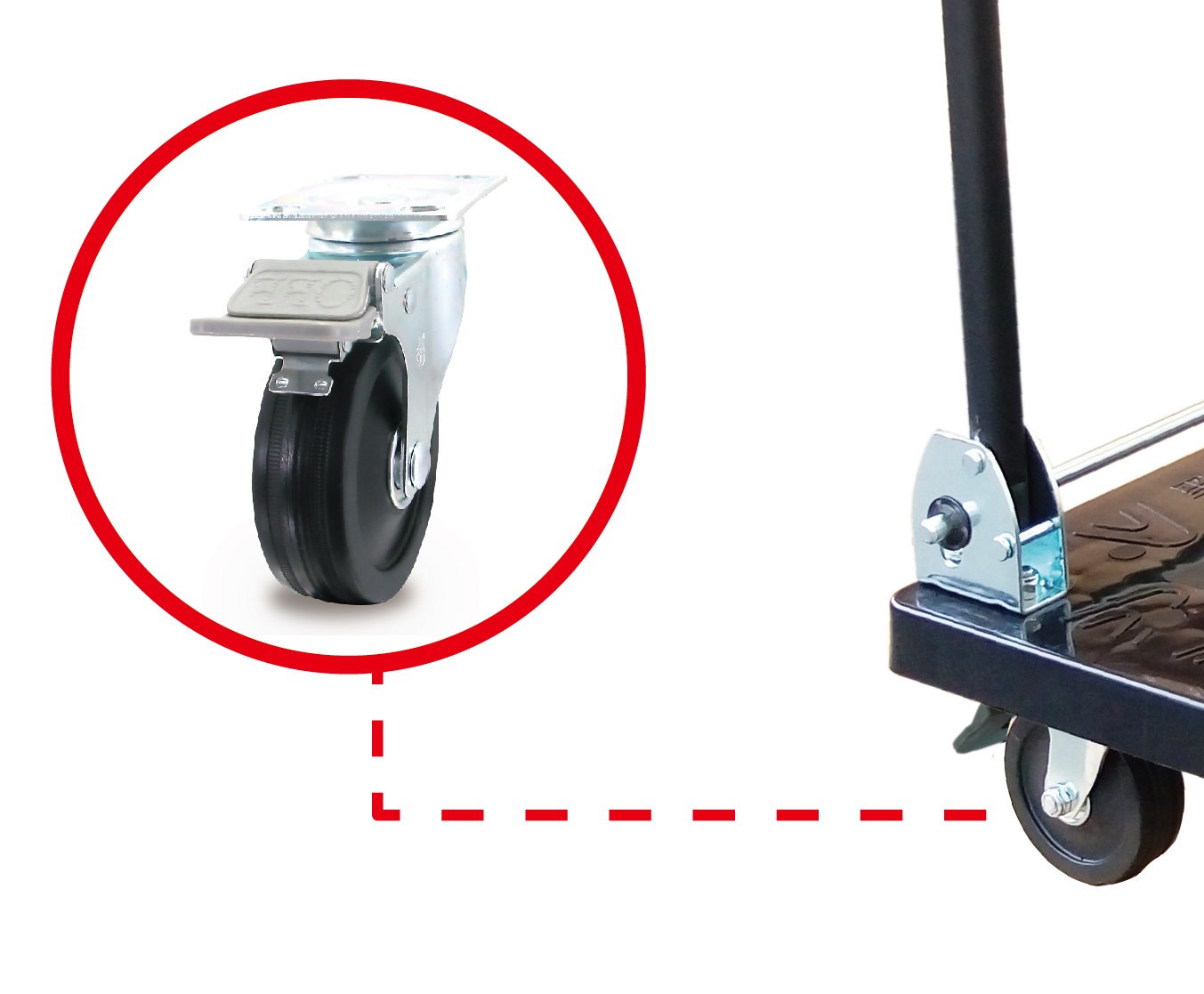 Le chariot modèle 805 007 180 est équipé de 2 roues fixes et 2 roues pivotantes avec bandage en caoutchouc non marquant, montées sur roulements à billes pour une qualité de roulage fluide et silencieuse.