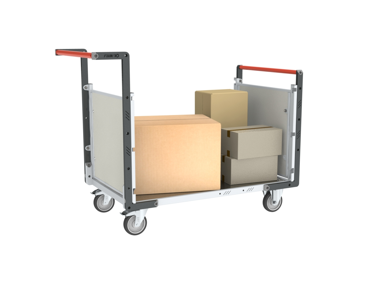 Conception robuste avec châssis en tube de 35 x 20 mm et renforts sous plateau. Plateau encastré. Dossier fixé au plateau par 3 points de fixation garantissant la longévité de l'assemblage dans le temps. Habillage en polypropylène alvéolaire : résistant aux chocs et aux produits chimiques, léger et facile d’entretien. Dossier en tube Ø 28 mm permettant une bonne prise en main. Hauteur ergonomique de poussée 945 mm. Roues 2 fixes + 2 pivotantes à frein à bandage TPE Ø 125 mm sur roulement à billes, non tachantes, silencieuses. Effort au démarrage réduit de 50 %. Conforme à la norme EN 1757. Personnalisation sur devis des plaques polypropylène avec votre logo, un thème…