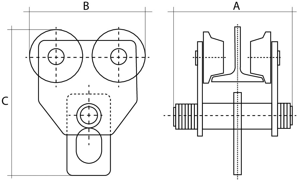 - Le chariot est composé de galets, d’un axe de suspension, de plaques latérales, d’un anneau de suspension, de rondelles et d’écrous.