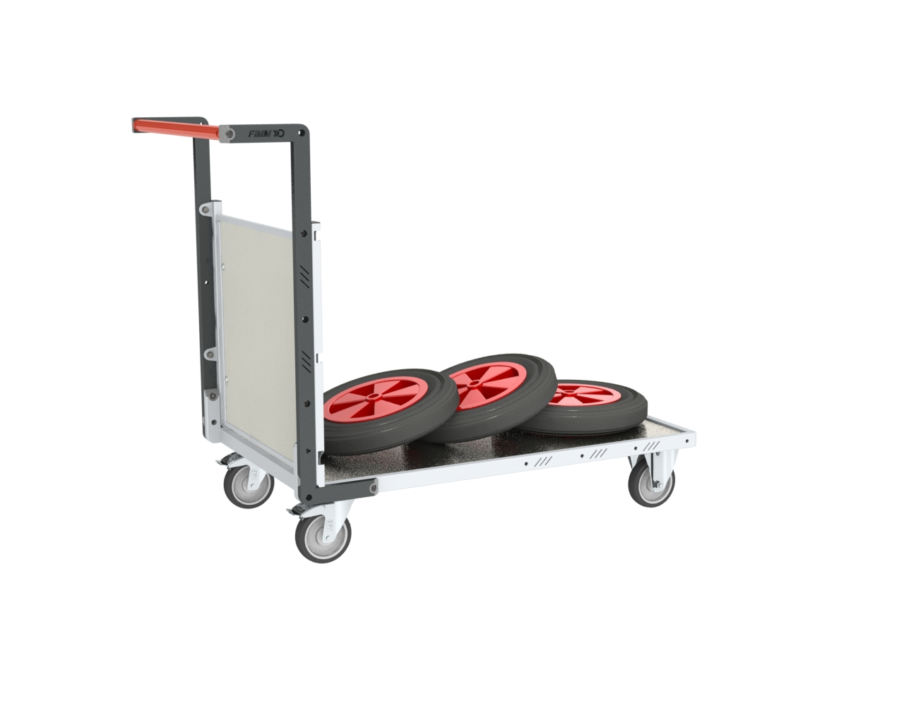 Le plateau est habillé en polypropylène alvéolaire, matériau léger, résistant aux chocs et aux produits chimiques, et facile d'entretien. Ce chariot est équipé de quatre roues de 125 mm de diamètre, dont deux fixes et deux pivotantes avec frein, à bandage en thermoplastique élastomère (TPE) non tachant et silencieux. L'effort au démarrage est réduit de 50 %, et les roues sont conformes à la norme EN 1757.
