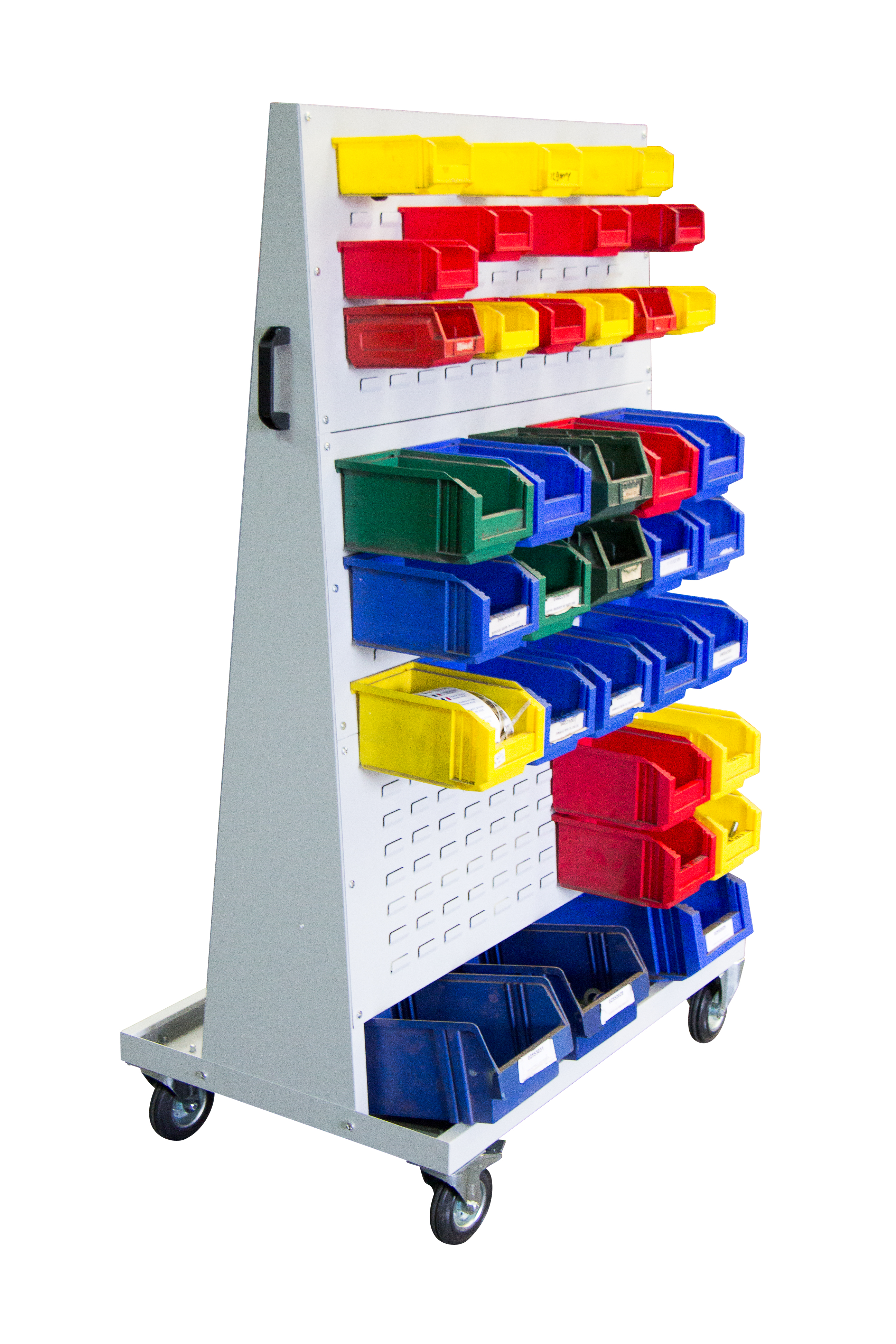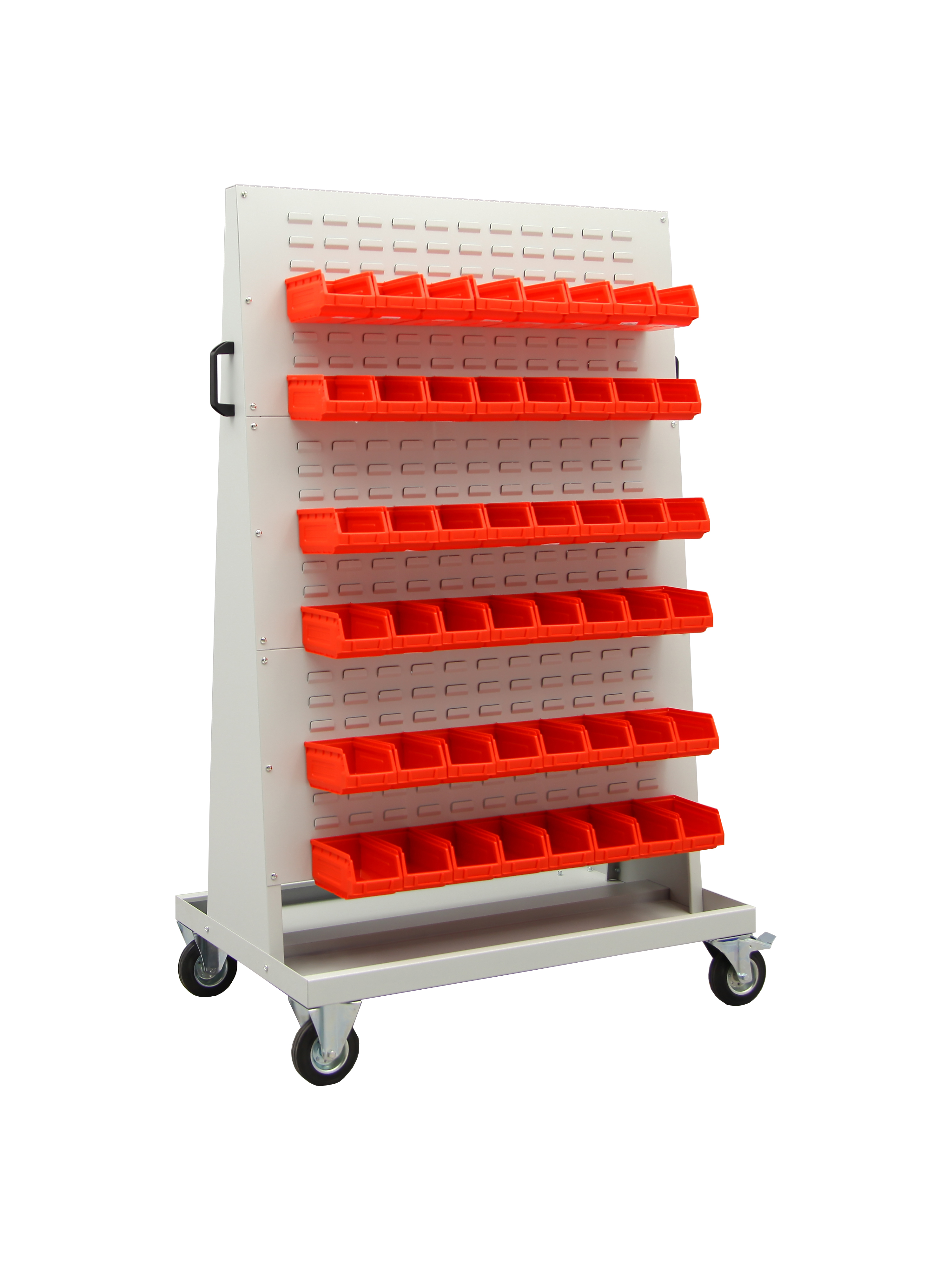Chariot porte-bacs à bec à ergots. Châssis à rebord et cadre triangulaire sur lequel sont vissées les plaques. En tôle acier robuste. Les 2 faces sont utilisées. Vendu sans bacs, à équiper selon vos besoins en composant votre propre sélection.