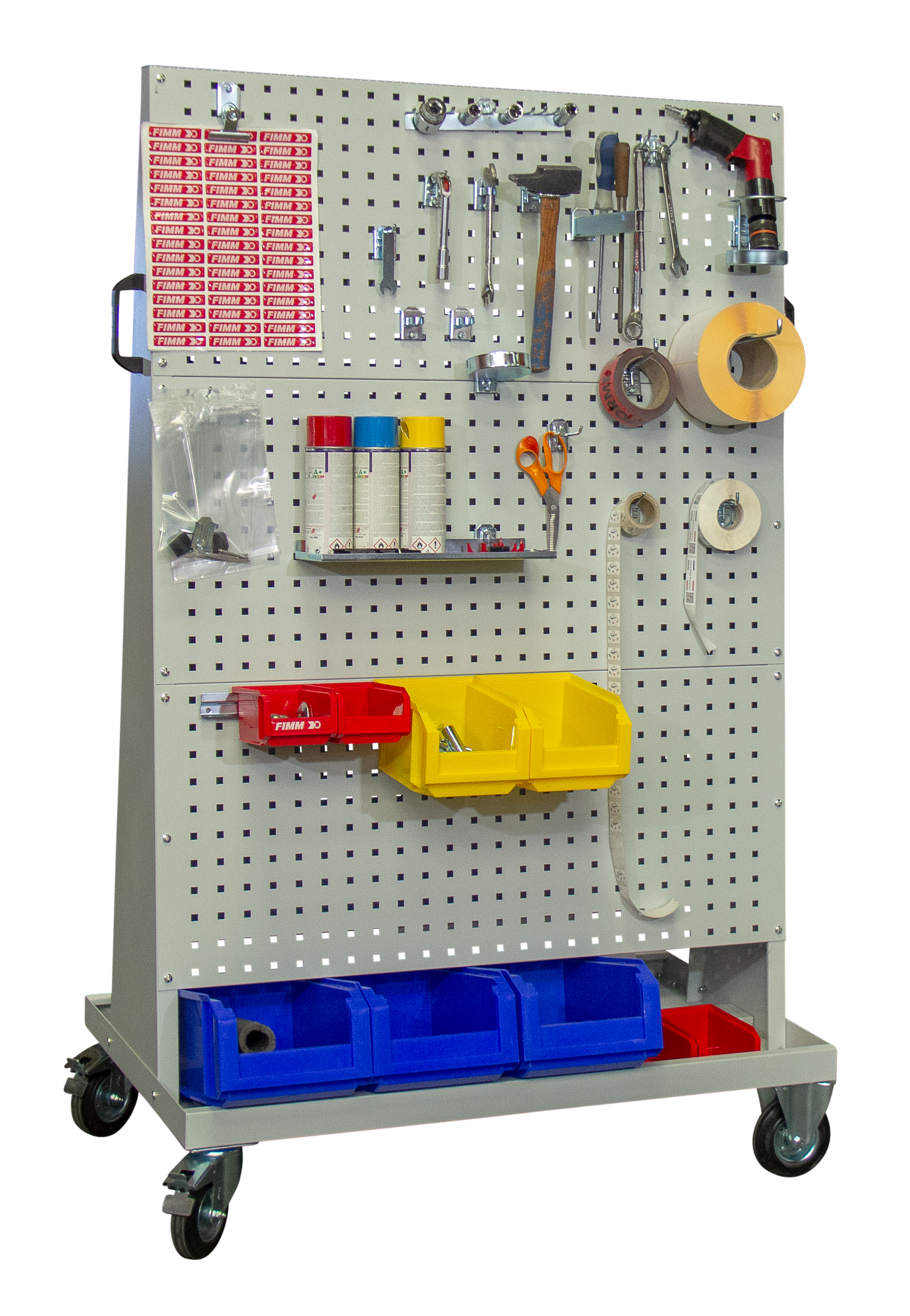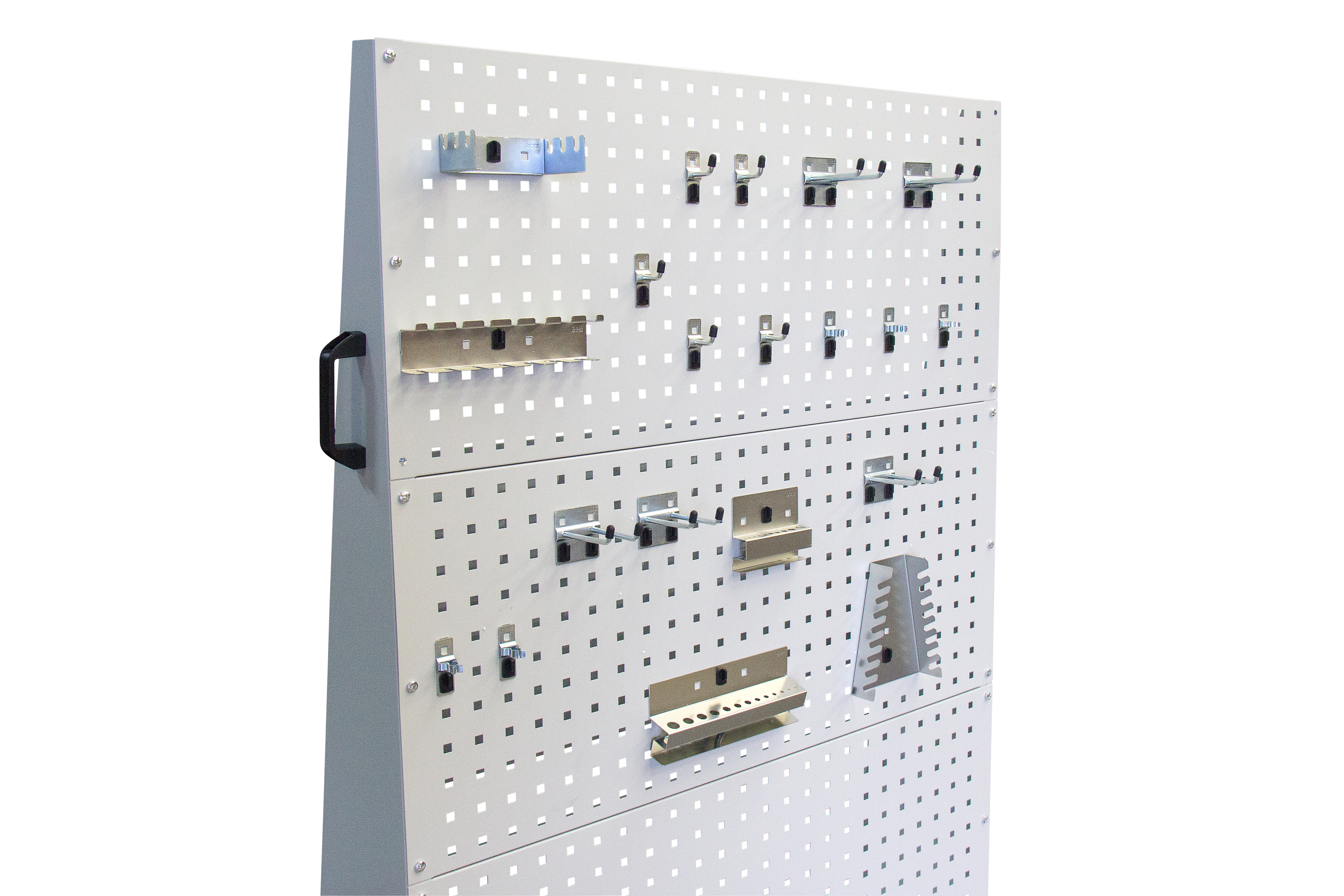 Chariot conçu pour accueillir des crochets porte-outils. Il est constitué d’un châssis à rebord et d’un cadre triangulaire sur lequel sont vissées les plaques en tôle d’acier robuste. Les deux faces des plaques sont utilisables et peuvent être équipées de porte-outils à crochet arrière. Le chariot est peint avec une peinture époxy résistante et durable. Il est équipé de deux poignées, une de chaque côté, pour faciliter la manutention. Les plaques seules peuvent également être fixées au mur ou dans une armoire. Le chariot est livré non monté, sans crochets ni accessoires, avec une notice de montage.