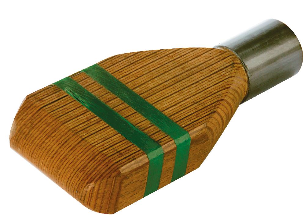 La tête du maillet est réalisée en bois lamellé-collé, matériau particulièrement stable et reconnu pour sa très grande résistance mécanique aux flexions, compressions et torsions. Ce bois présente une rectitude et une homogénéité supérieures au bois massif.