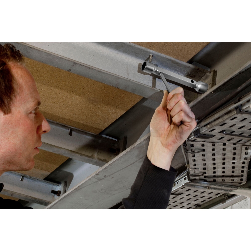 Cette clé est conçue pour offrir une ouverture complète, facilitant le passage de tiges filetées très longues. Son corps hexagonal garantit un serrage optimal avec une clé classique, rendant son utilisation simple et efficace. Le trou de passage permet d'utiliser des broches spécifiques, comme les modèles 160A.1 et 160A.2, pour des dimensions variées.