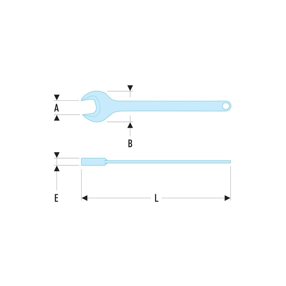 La clé présente une extrémité ouverte plus épaisse, garantissant une résistance accrue lors de l'utilisation. Un trou de suspension est intégré pour un rangement pratique sur panneau ou pour éviter la perte de l'outil. Elle est adaptée à des dimensions métriques variant de 30 à 75 mm, ce qui en fait un choix polyvalent pour divers travaux techniques.