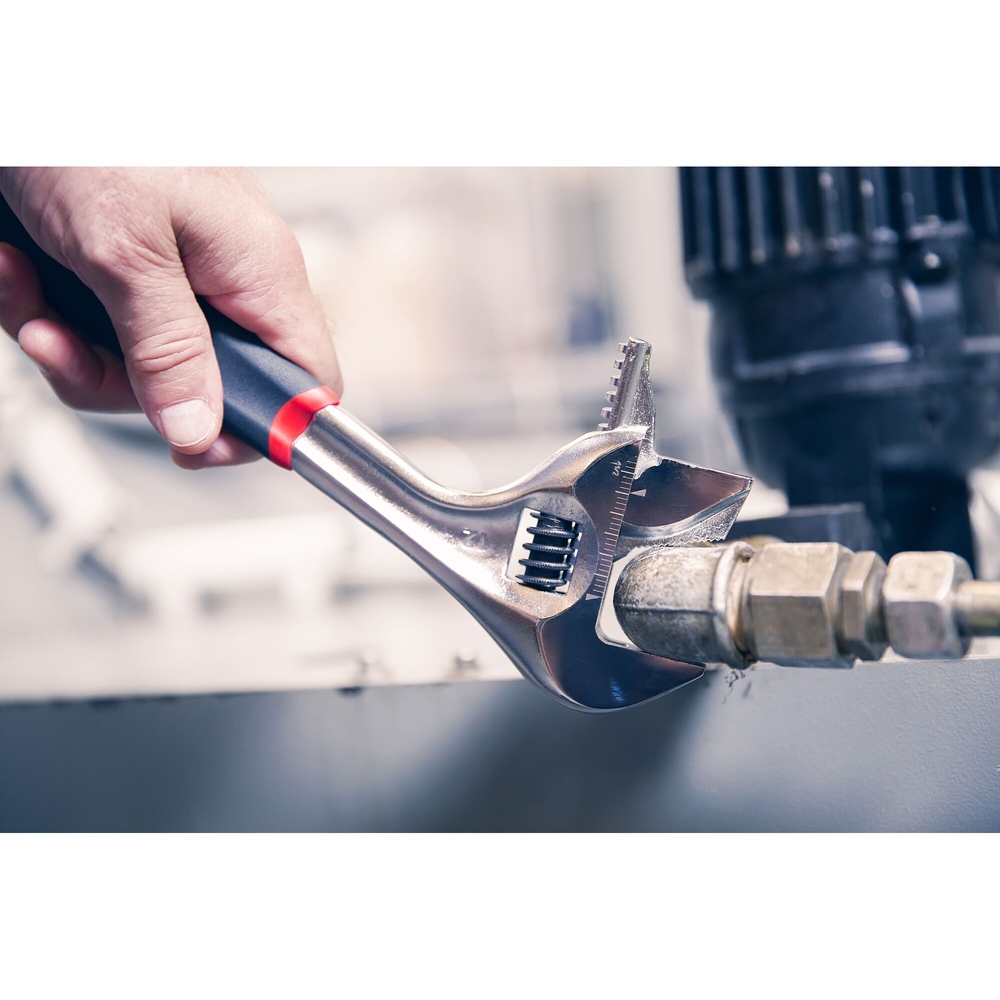 Cette clé à molette de 12 pouces se caractérise par son mécanisme de réglage rapide, permettant un serrage efficace et instantané de la mâchoire sur l'écrou. Grâce à son profil de mâchoire mince, vous bénéficierez d'une meilleure accessibilité dans les espaces restreints. Son ouverture extra-large élargit les possibilités d'utilisation, vous permettant de travailler sur des dimensions variées avec un seul outil.