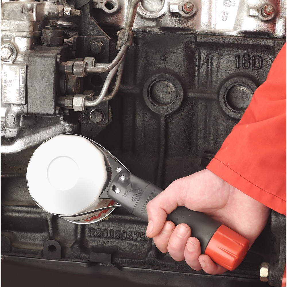 Conçue pour un usage sur les véhicules de tourisme, elle offre une manipulation aisée. Grâce à son angle de reprise de l'effet cliquet de 5°, elle permet un accès facilité aux filtres à huile, réduisant ainsi le temps de travail. Il est recommandé de l'utiliser sur des filtres dont le diamètre varie de 66 à 106 mm.