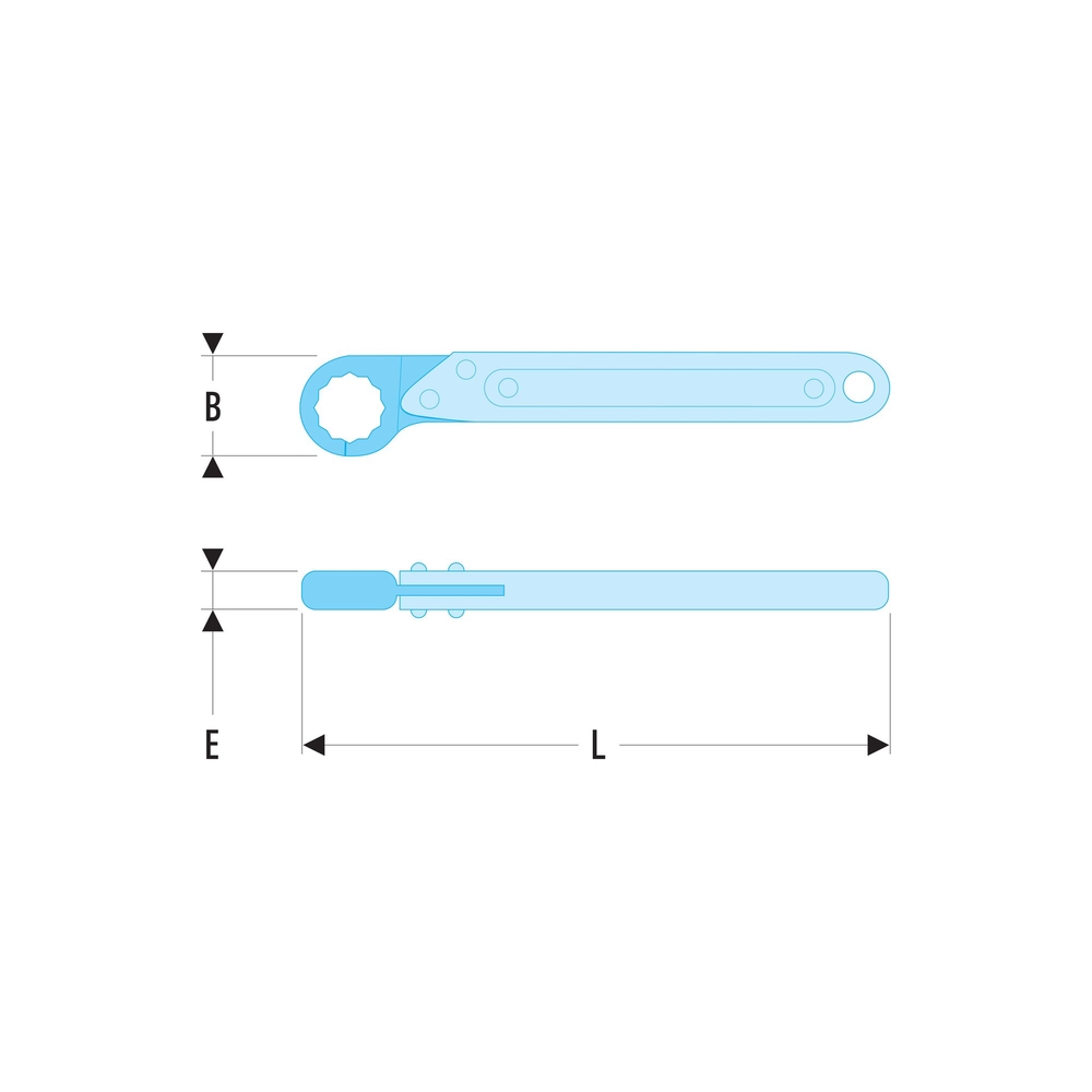 La clé présente une tête hexagonale composée de six pans pour des tailles de 7 à 10 mm, et de douze pans pour des tailles allant de 11 à 32 mm. De plus, elle est équipée d'un trou de suspension, permettant un rangement facile sur panneau ou un suspension confortable, évitant ainsi toute perte ou chute. Ce modèle polyvalent est adapté à de nombreuses applications industrielles.
