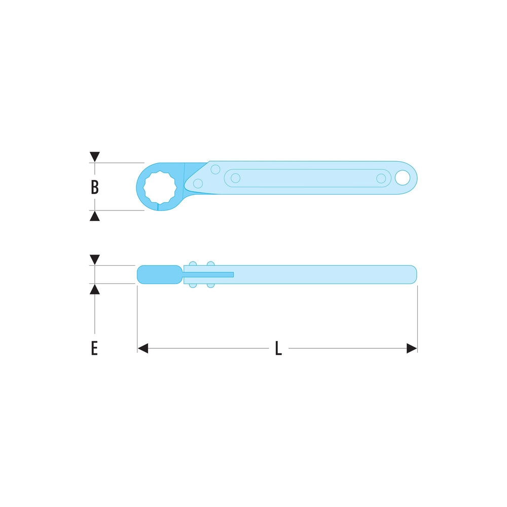 La clé présente une tête à 6 pans pour des dimensions de serrage allant de 7 à 10 mm et une tête à 12 pans pour des écrous variant de 11 à 32 mm. Sa conception robuste et ergonomique assure une longévité et une durabilité, en faisant un outil fiable pour les professionnels.