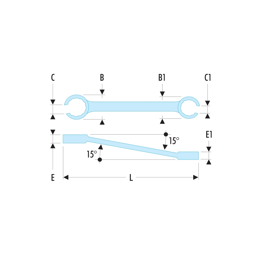 Cette clé offre un décalage de 15°, augmentant la maniabilité et facilitant l'accès dans des espaces restreints. Elle dispose de deux types de tête : la tête à 6 pans, pour des dimensions de 8x10 à 12x14 mm et de 5/16"x3/8" à 7/16"x1/2", ainsi que la tête à 12 pans, pour des dimensions de 14x17 à 36x41 mm et de 9/16"x5/8" à 1"x11/8".