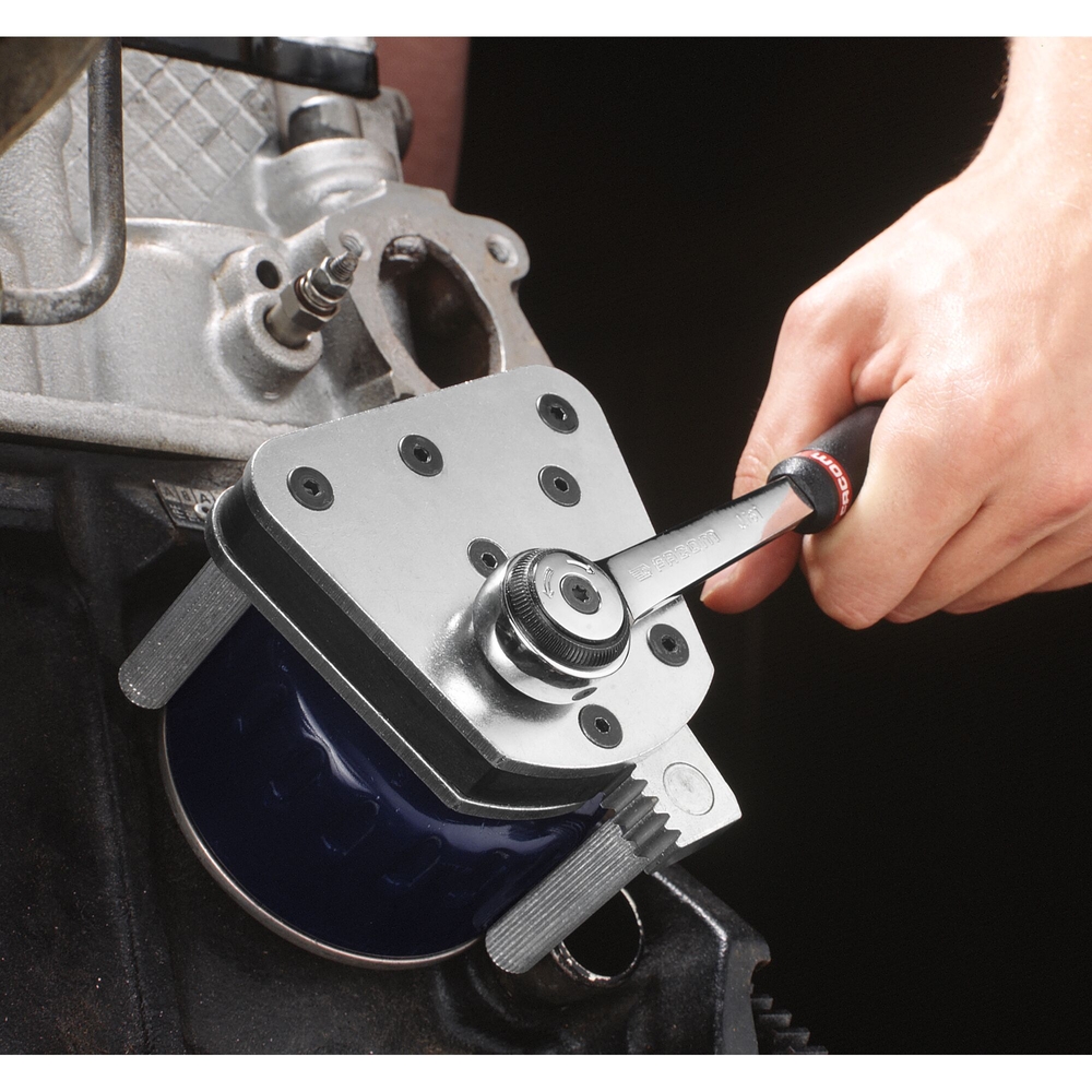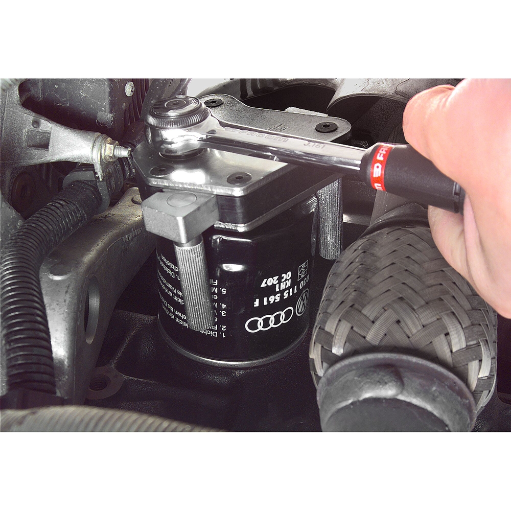 Cette clé fonctionne par un mécanisme de serrage automatique, ce qui permet de s'adapter à différents diamètres de filtres à huile. Conçue principalement pour les véhicules de tourisme, elle offre un excellent maintien lors des opérations de démontage et de montage. Pour une utilisation optimale, il est conseillé de l'utiliser avec un entraînement de 3/8''.