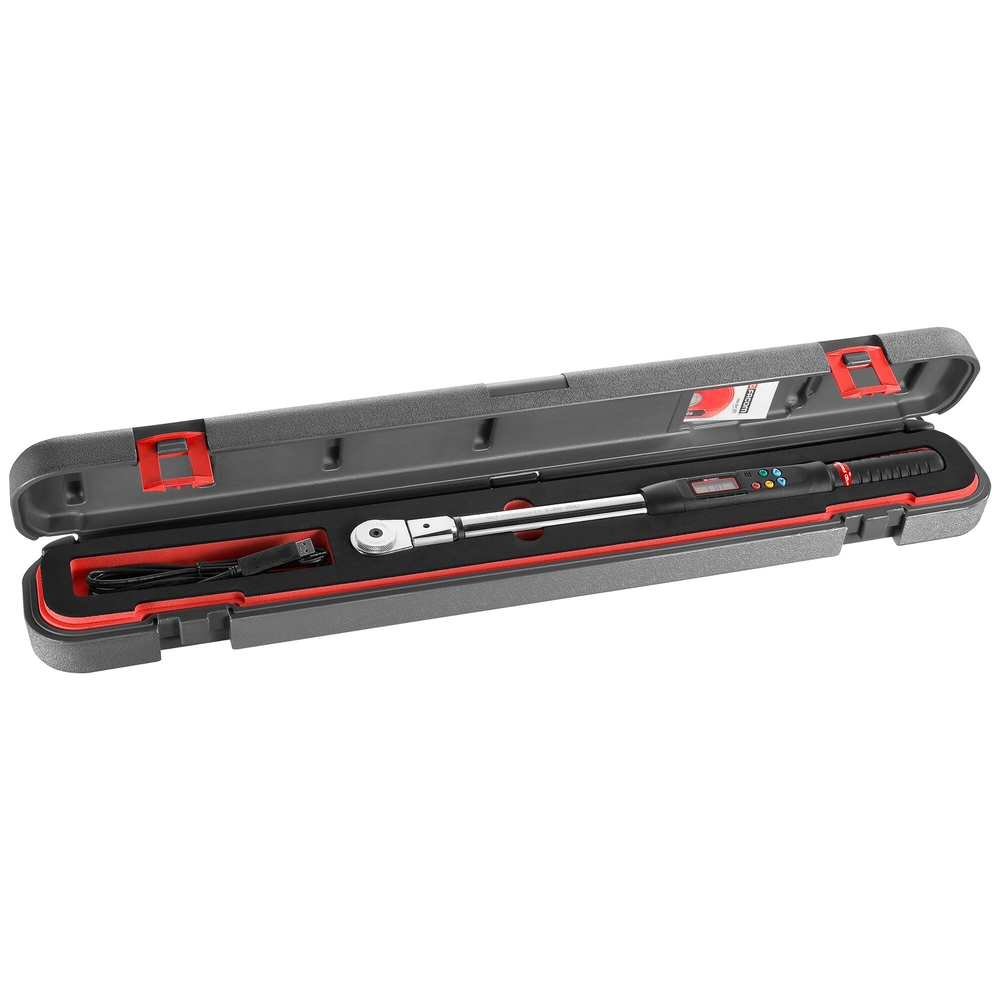 Avec une capacité de 200 Nm, cette clé offre une précision de ± 2 % entre 20 % et 100 % et de ± 4 % entre 5 % et 20 %. Elle est compatible avec plusieurs unités de mesure : N.m, lbf.ft, lbf.in et Kg.cm. Dotée d'attachements de 9 x 12 mm et 14 x 18 mm, elle est livrée avec un certificat d'étalonnage ISO 6789. Son utilisation est facilitée par une mémoire pouvant contenir 250 valeurs et une liaison PC via USB. Chaque clé est fournie dans un coffret plastique avec un plateau mousse pour un rangement optimal.