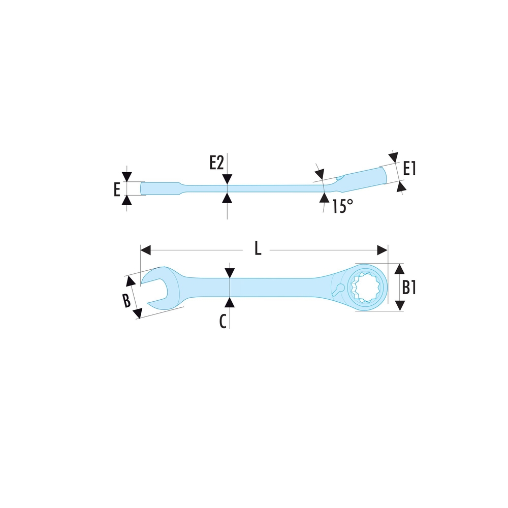 La clé offre une taille métrique de 14 mm avec un incrément de 5°, et 6° pour les cotes 8 et 9 mm, facilitant un travail précis. Sa tête annulaire et sa tête ouverte coudée, toutes deux inclinées à 15°, assurent un accès optimal aux points de fixation. De plus, sa finition chrome satiné protège contre la corrosion et garantit une longévité optimale.
