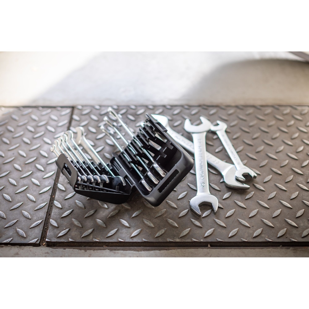 Ce jeu est conçu pour un accès facile grâce à sa fourche ouverte qui permet de glisser l'outil en position par le côté de l'écrou ou du boulon. Les clés à fourche double disposent d'un déport de 15°, ce qui facilite les travaux dans des espaces restreints. Un support de rangement est inclus, garantissant un stockage ordonné et une visualisation rapide des clés.