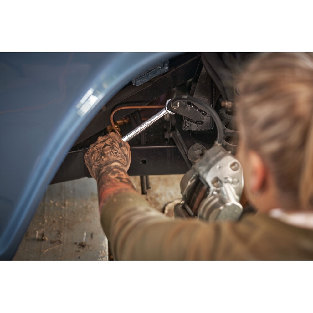 Le support de rangement inclus permet de garder l'ensemble de vos clés bien organisé. Ce jeu de clés mixtes offre un déport de 15° pour une meilleure accessibilité et un œil à 12 pans qui s’adapte facilement à tous les types d’écrous et boulons. Optimisez vos projets avec cet indispensable jeu d'outils.