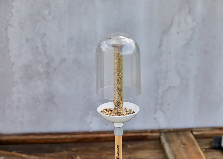 Le coeur du système d'objets décoratifs ClickUp! GARDENA est un manche en bois et chaque élément décoratif se connecte et se déconnecte très facilement en un "clic" au manche en bois. La connexion entre la mangeoire à oiseaux ClickUp! et le manche en bois est parfaitement stable et sûre.