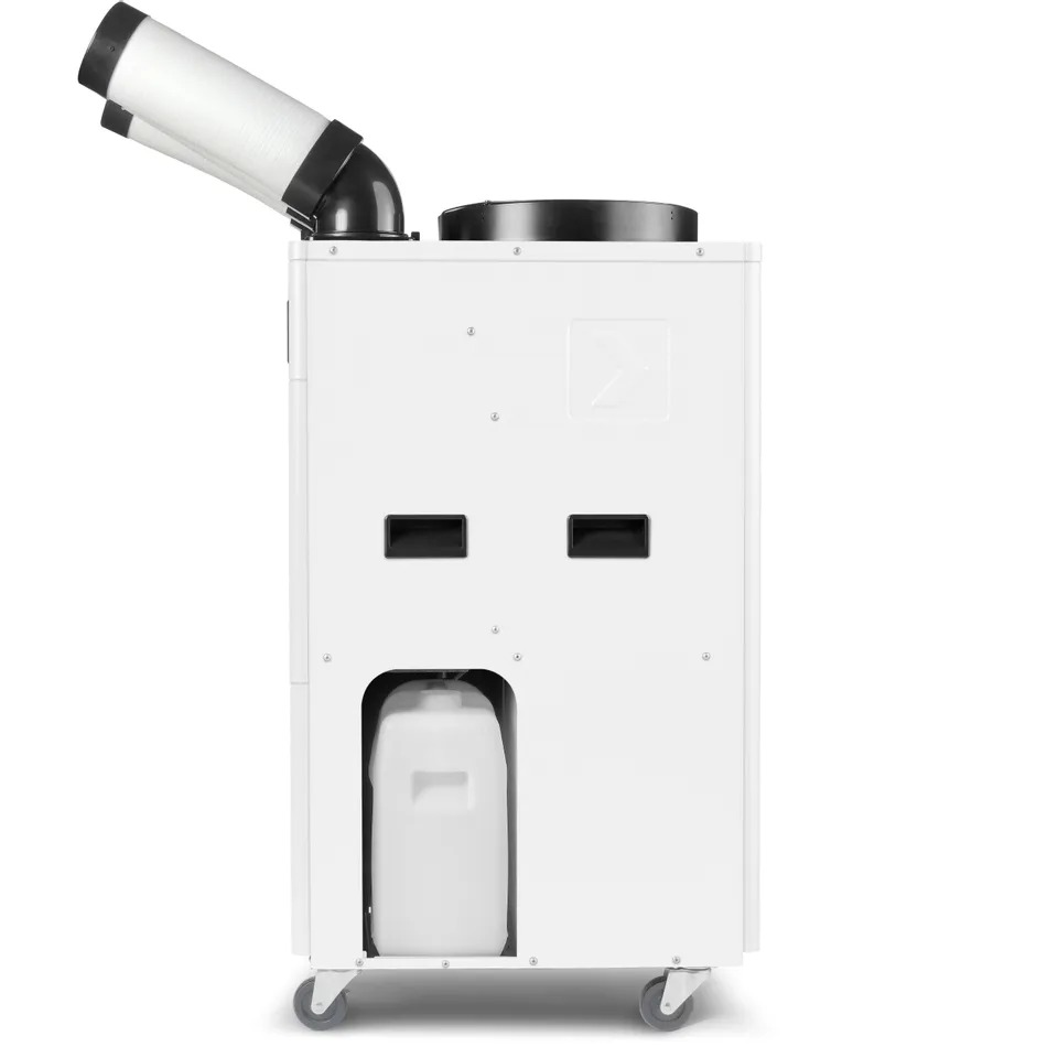 Le spotcooler est équipé d’un thermostat électronique et d’un panneau de commande intuitif avec écran LED, permettant de sélectionner le mode souhaité, de régler les heures de fonctionnement, d’activer ou d’arrêter l’appareil automatiquement et de surveiller le niveau du réservoir d’eau. L’appareil dispose d’un réservoir d’eau de 25 litres, d’un voyant d’avertissement lorsque celui-ci est plein, d’un filtre à air lavable pour protéger les composants internes, et d’une possibilité de raccord pour l’évacuation de l’air chaud vers l’extérieur.