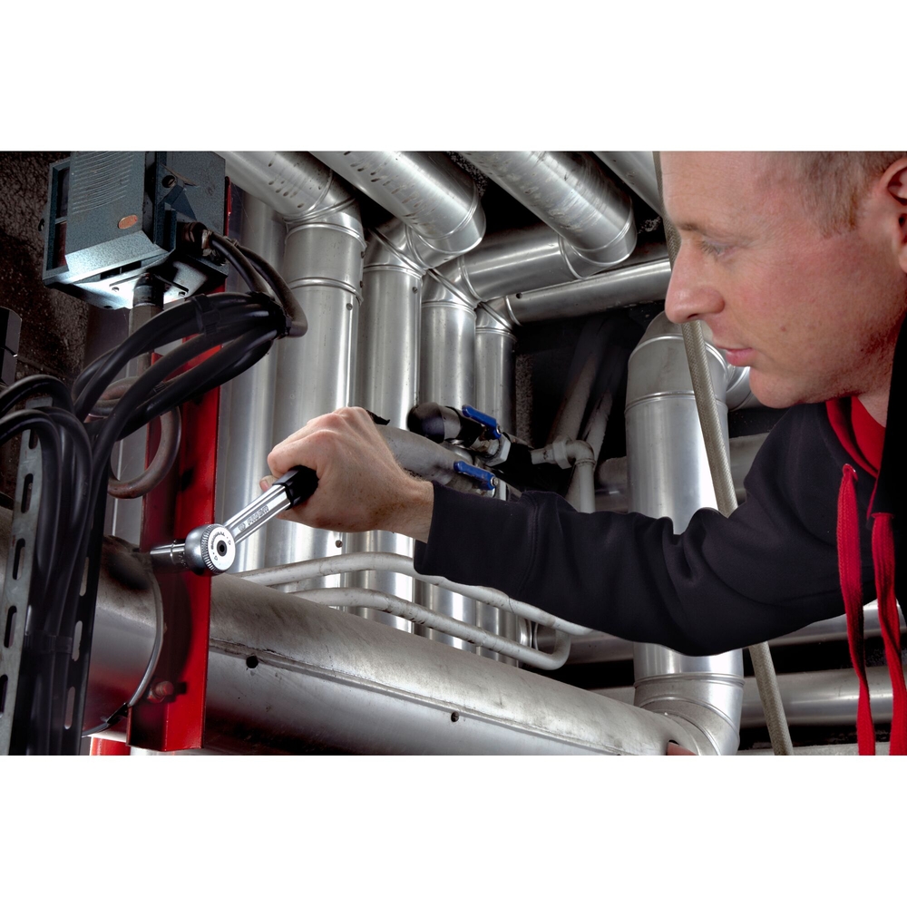 Ce cliquet se distingue par son mécanisme à 72 dents, offrant une reprise à 5°, ce qui le rend particulièrement adapté aux espaces restreints. Sa tête ultra-compacte et son inversion par chapeau rotatif facilitent son maniement. La poignée en élastomère monomatière assure une adhérence optimale tout en résistant aux abrasions et aux produits chimiques comme le SP95, le gasoil, ou l'acétone. Pour une utilisation en hauteur, un trou dans la poignée permet l'accrochage.