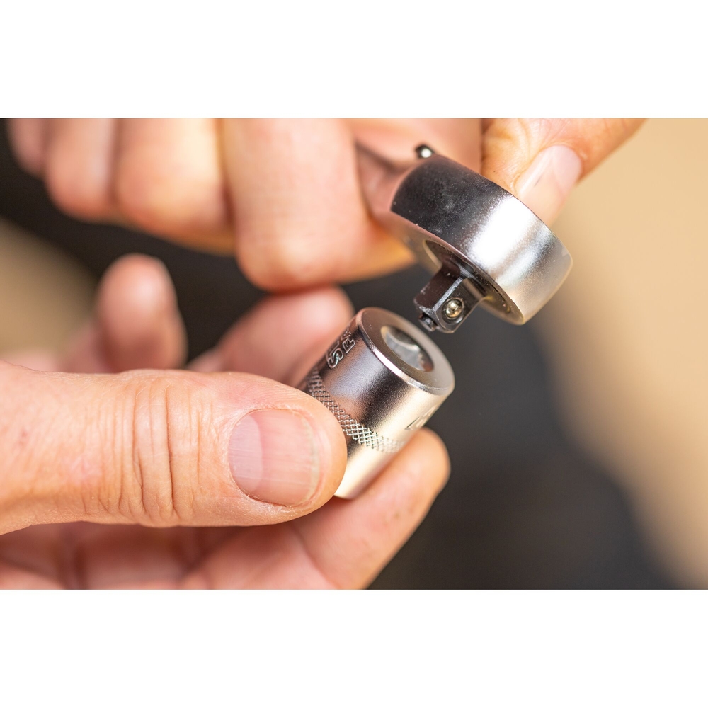 Ce jeu comprend un cliquet avec un mécanisme à double cliquet, offrant une précision optimale grâce à un angle de reprise de 3°. Son utilisation est facilitée par un inverseur à profil fin qui prévient les inversions accidentelles, permettant ainsi une manipulation aisée à une main. Le bouton de libération rapide assure un retrait facile des douilles, ce qui est particulièrement utile dans des environnements encombrés.