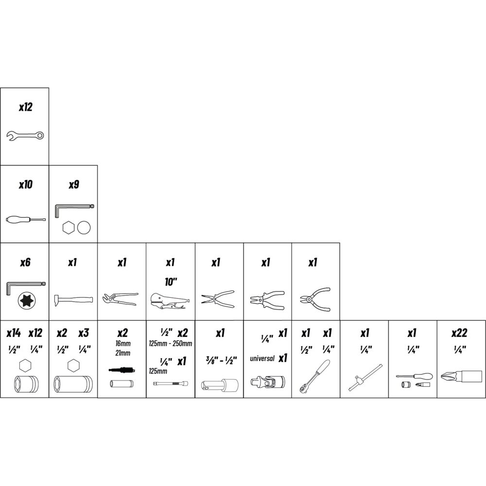 - Outils variés incluant clés mixtes, clés Torx, tournevis, pinces et marteau, offrant une solution complète.