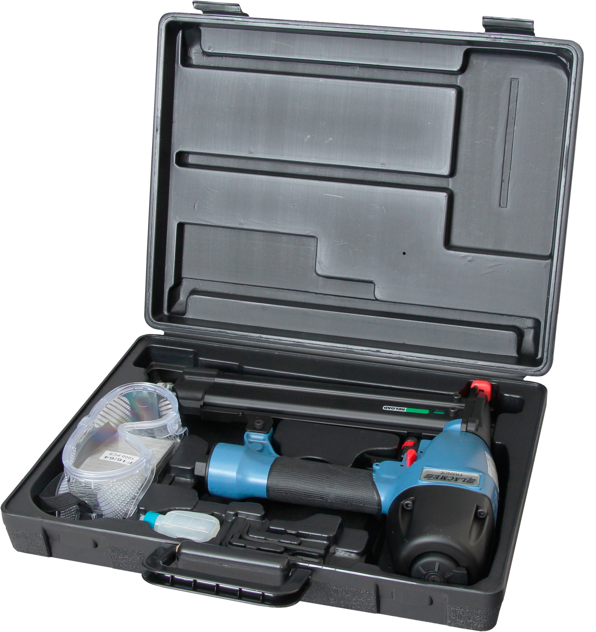 Modèle professionnelCoffret complet : cloueuse 64 mm pour pointes tête homme type 16 (1,4 × 1,26 : de 35 à 64 mm) - Sécurité de contact - Poignée avec revêtement isolant - Lunettes de sécurité - 1 boîte 1.000 pointes long. 64 mm.