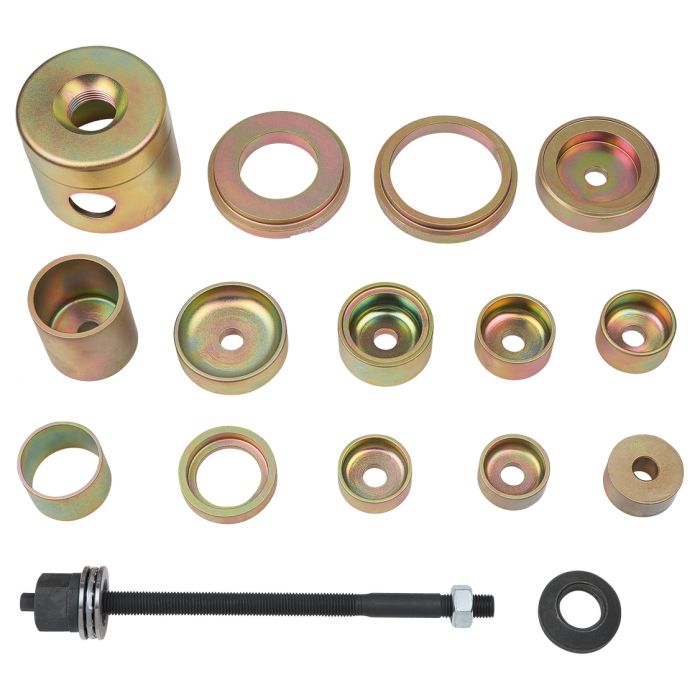 Le coffret d'outils pour silentblocs VAG, composé de 18 pièces, est conçu pour faciliter le montage et le démontage des silent-blocs.