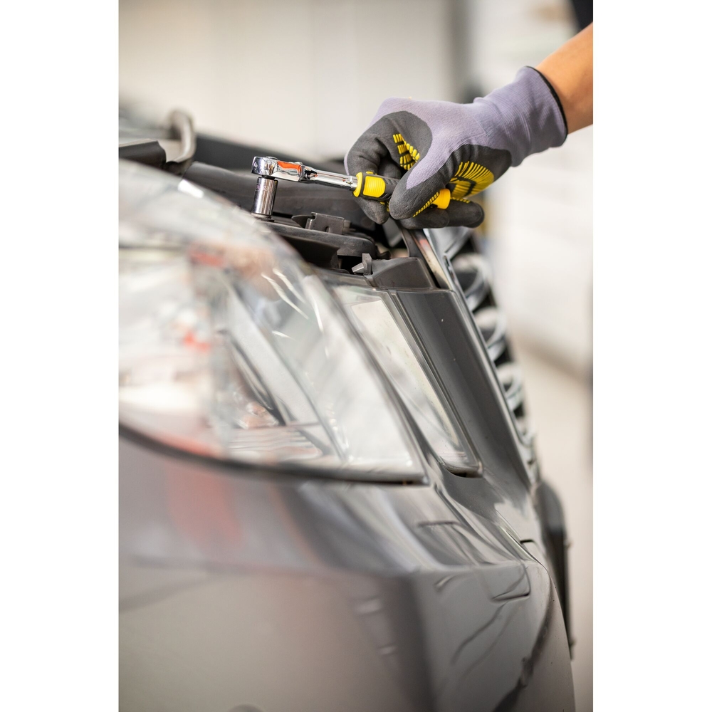 Ce jeu comprend une clé à cliquet à 72 dents permettant un angle de reprise optimal de 5°, assurant une utilisation ergonomique. Avec son bouton de libération rapide, le retrait des douilles est simplifié, tandis que le profil fin de l'inverseur se manie aisément d'une seule main. Idéal pour les travaux dans des espaces confinés, il a été conçu pour maximiser efficacité et confort.