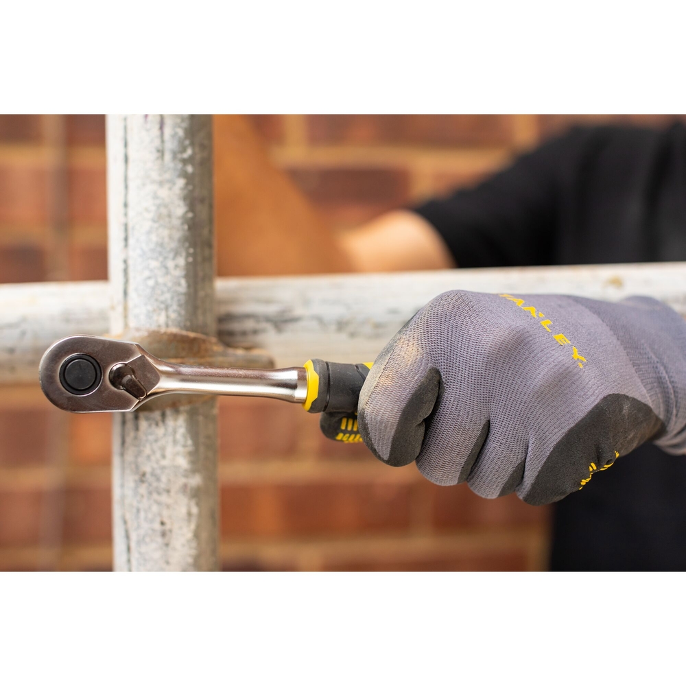Ce jeu comprend un cliquet 3/8'' à 120 dents, 17 douilles six pans, deux rallonges et divers embouts. Le cliquet, avec son mécanisme à double cliquet et un angle de reprise de 3°, assure une précision et une vitesse de travail optimales. Le bouton de libération rapide permet un échange aisé des douilles, tandis que l'inverseur à profil fin facilite l'utilisation à une seule main, réduisant les risques d'inversion accidentelle. Sa texture offre une bonne prise même dans des conditions difficiles.