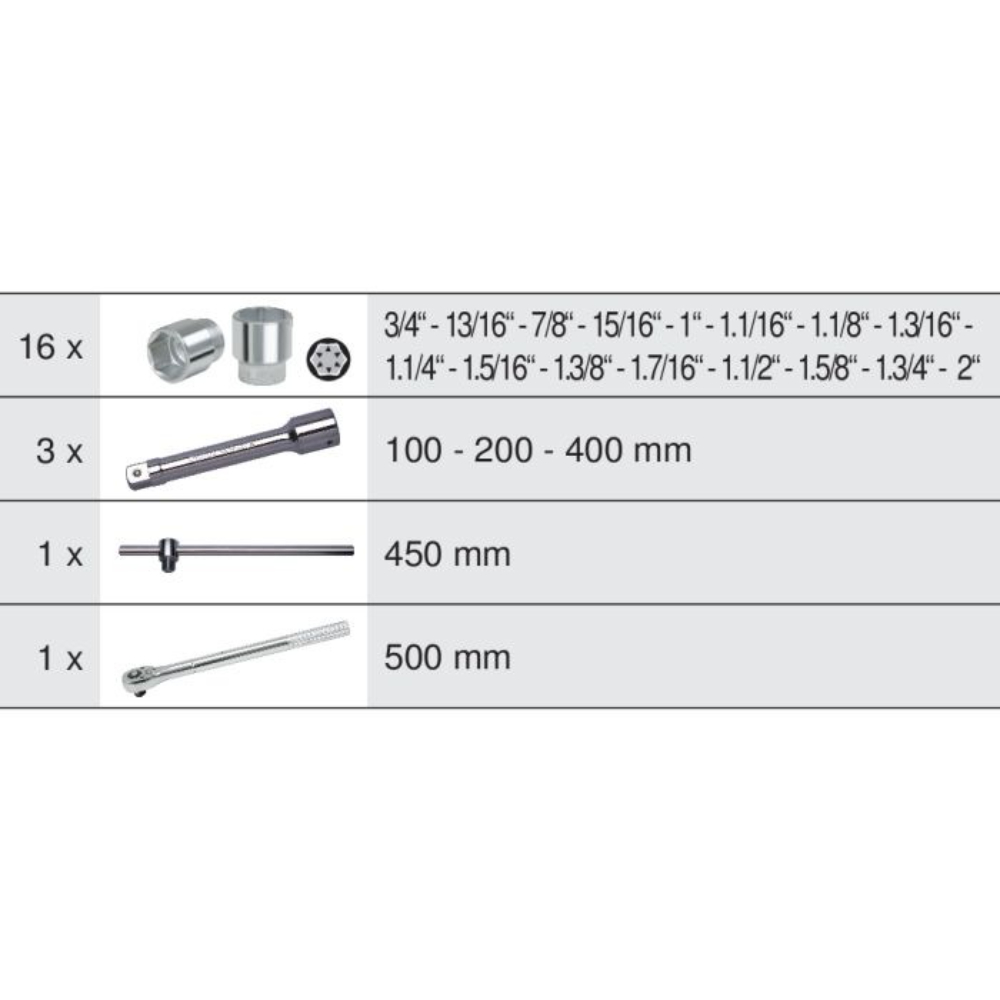 Conçu pour un déverrouillage rapide et un usage réversible, ce coffret garantit une efficacité optimale lors de vos interventions. Le carré d'entraînement de 3/4" s'adapte parfaitement aux vis et boulons de votre équipement, tandis que les 24 dents assurent une prise ferme et sécurisée.