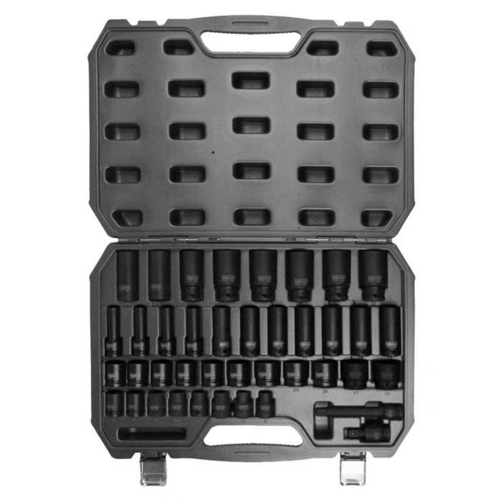 Découvrez le coffret de douilles 1/2'' à chocs courtes et longues, composé de 40 pièces, idéal pour les professionnels et les amateurs de bricolage.