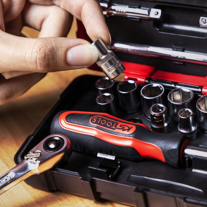 Ce coffret ultra-compact, avec son design bi-matière et ses coins renforcés, convient à divers usages professionnels et domestiques. Il est idéal pour les réparations et l'entretien de votre matériel, permettant de travailler efficacement même dans des espaces restreints. Utilisez le cliquet réversible à 72 dents pour un vissage précis et rapide de vos boulons et vis.
