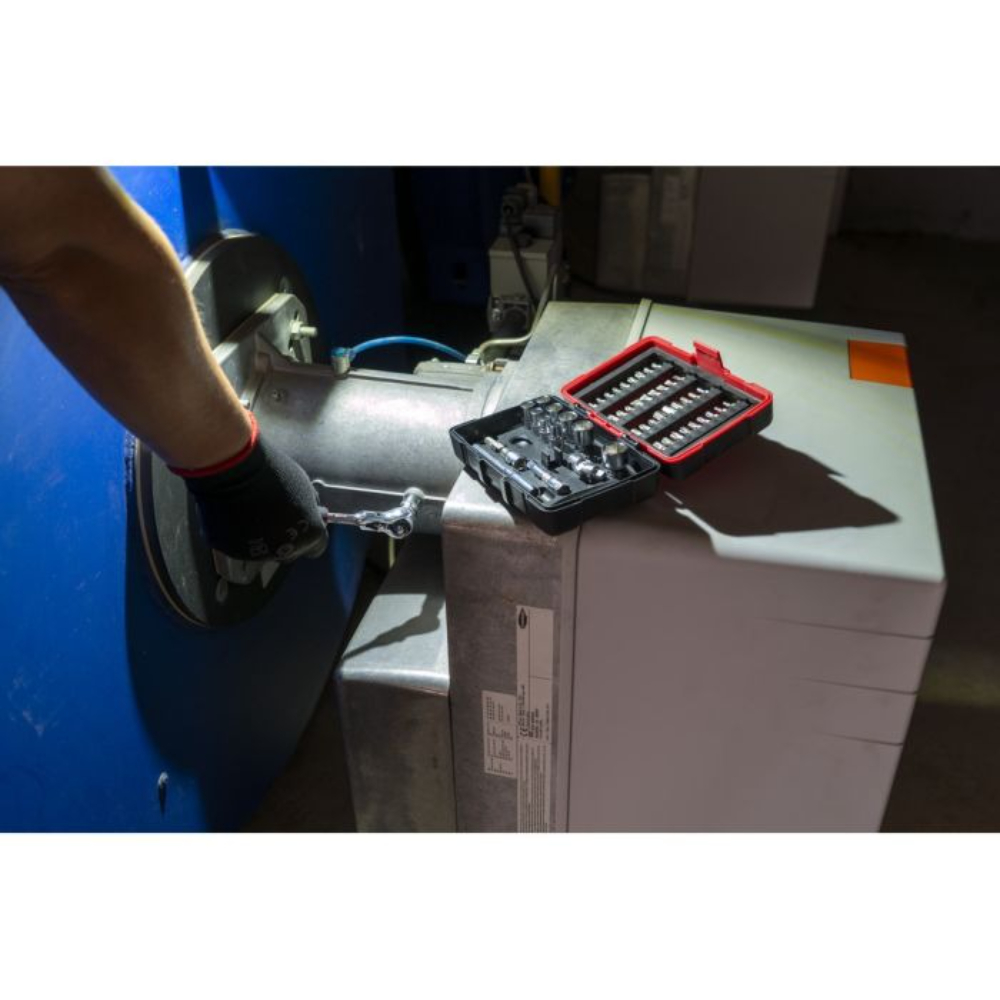 Le cliquet MODIFIX, avec sa fonctionnalité réversible et son articulation à tête pivotante, assure une utilisation aisée dans tout type d'espace. Sa finition chromée satinée offre non seulement une esthétique soignée, mais également une résistance accrue à la corrosion. Le coffret, conçu en bi-matière et doté de coins renforcés, garantit une protection optimale de vos outils tout en facilitant leur rangement.