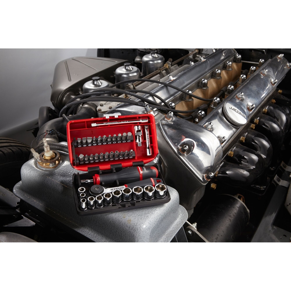 Ce coffret est conçu pour offrir une utilisation optimale avec un cliquet étanche de 1/4", des douilles métriques et des embouts variés. Pour l'utilisation, il est conseillé de choisir la douille adaptée à la vis ou à l'écrou, puis de fixer la douille au cliquet pour un serrage efficace. Les rallonges permettent d'atteindre les zones difficiles, tandis que la poignée tournevis assure une prise en main confortable.