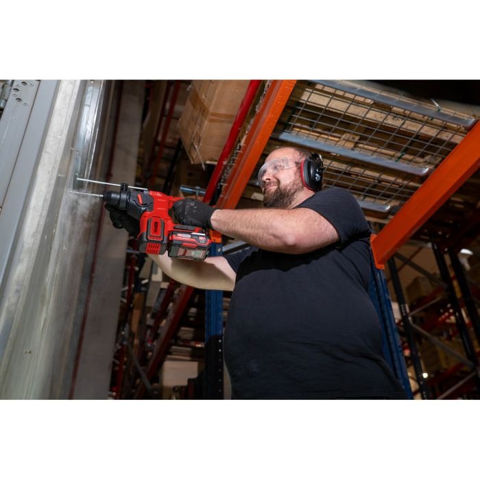 Ce perforateur se distingue par ses caractéristiques techniques performantes : puissance de 900W, une vitesse de rotation à vide de 1600 Tr/min, et une capacité de perçage maximale de 24 mm dans le béton, 13 mm dans l'acier et 28 mm dans le bois. Avec une fréquence de 5500 coups/min et un poids de 6 kg, il est léger et confortable à manipuler. Livré avec deux batteries lithium-ion de 18V 4Ah et un chargeur, il est également doté d'un indicateur LED pour suivre le niveau de charge. La butée de profondeur de 200 mm permet des réglages précis, et son corps en aluminium associé à une coque en plastique renforcé assure robustesse et durabilité.