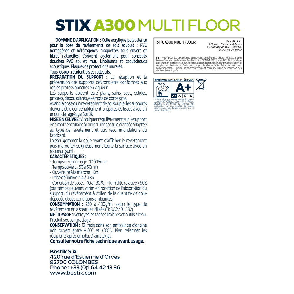 Découvrez Colle acrylique polyvalente Stix A300 multi floor - revêtements sols ou murs - Ivoire 12kg - BOSTIK - 30615977 disponible à l'achat
