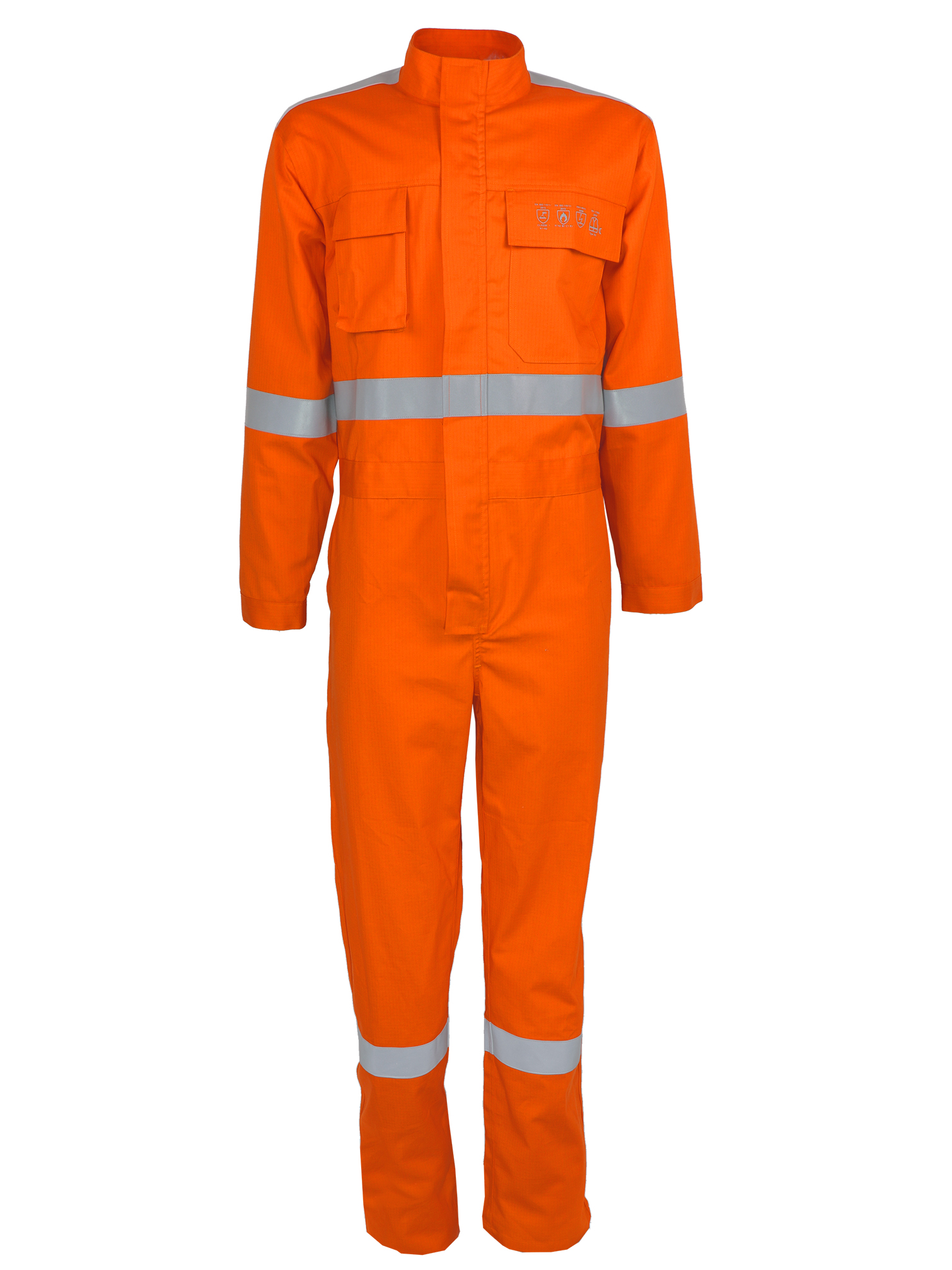 Combinaison multi-risques.Matière: 98% coton et 2% carbone (ripstop), 280 g/m².5 poches extérieures.Fermeture à glissière (double curseur)sous rabat auto-agrippant. Taille élastique.Poignets avec bandes auto-aggripantes.Bandes rétro-réfléchissantes.(visualisation améliorée pour des situations à risque modéré).Coloris: orange.