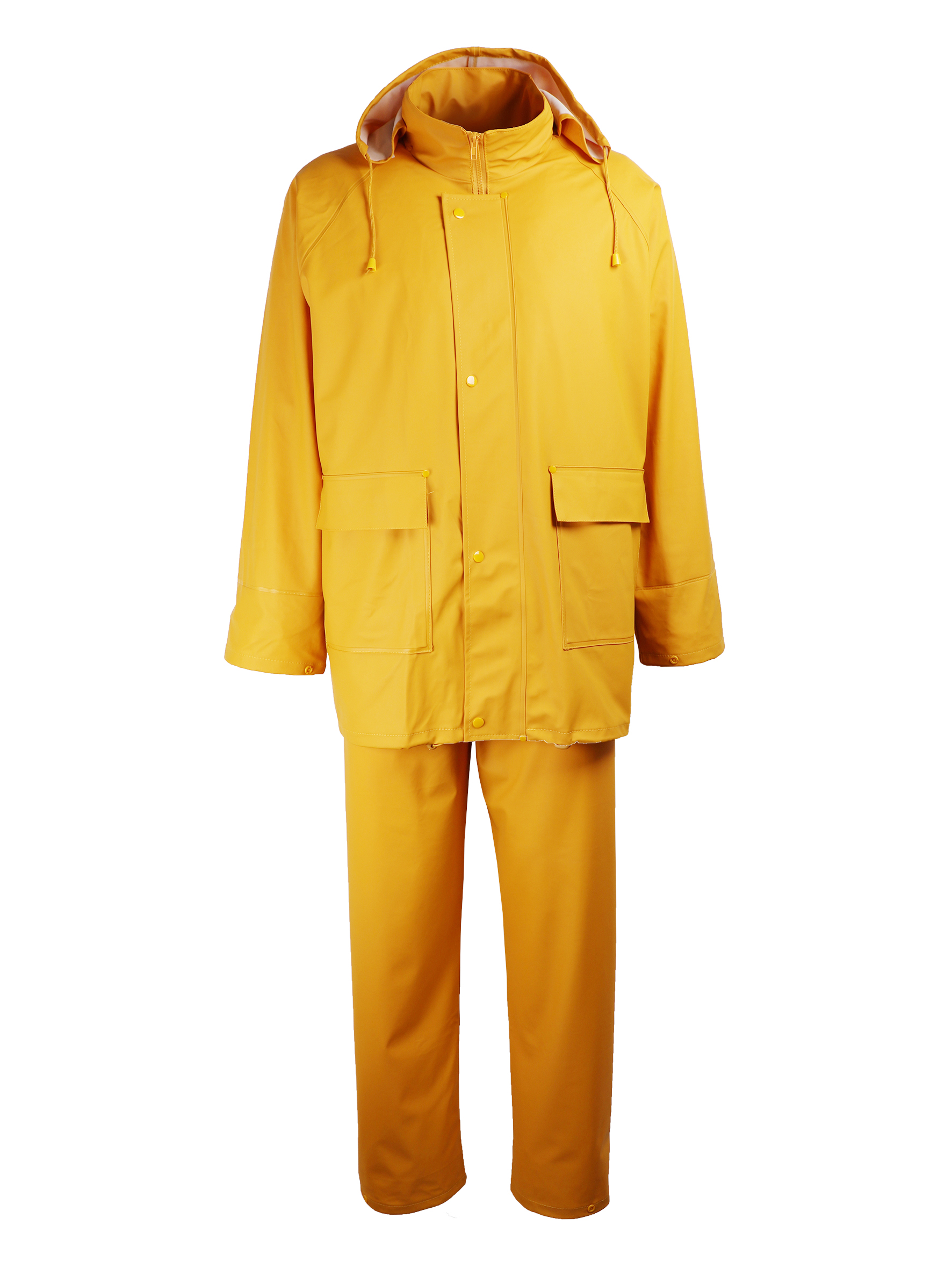 Conçu pour affronter les intempéries, ce complet de pluie associe une matière souple en polyuréthane/PVC à un support polyester robuste de 280 g/m², garantissant confort et résistance. Il se compose d’une veste avec capuche intégrée, enroulable dans le col, dotée d’un système de fermeture zippée protégée par un rabat à pressions, de deux poches pratiques avec rabat, d’un dos ventilé et d’un ajustement à la taille pour une tenue efficace. Le pantalon assorti offre une taille élastiquée avec cordon de serrage, une braguette avec pression, un ajustement bas de jambe par pressions ainsi que des passe-mains pour plus de praticité. L’ensemble est entièrement équipé de coutures soudées assurant une parfaite étanchéité. Son coloris jaune vif favorise la visibilité, tandis que sa finition soignée et son conditionnement individuel zippé en font un produit à la fois fonctionnel et facile à stocker. Conforme à la norme EN 343 pour les vêtements de protection contre les intempéries, ce vêtement est destiné aux usages en agriculture, espaces verts, mariculture, second œuvre ou transport, dans le cadre de risques mineurs.