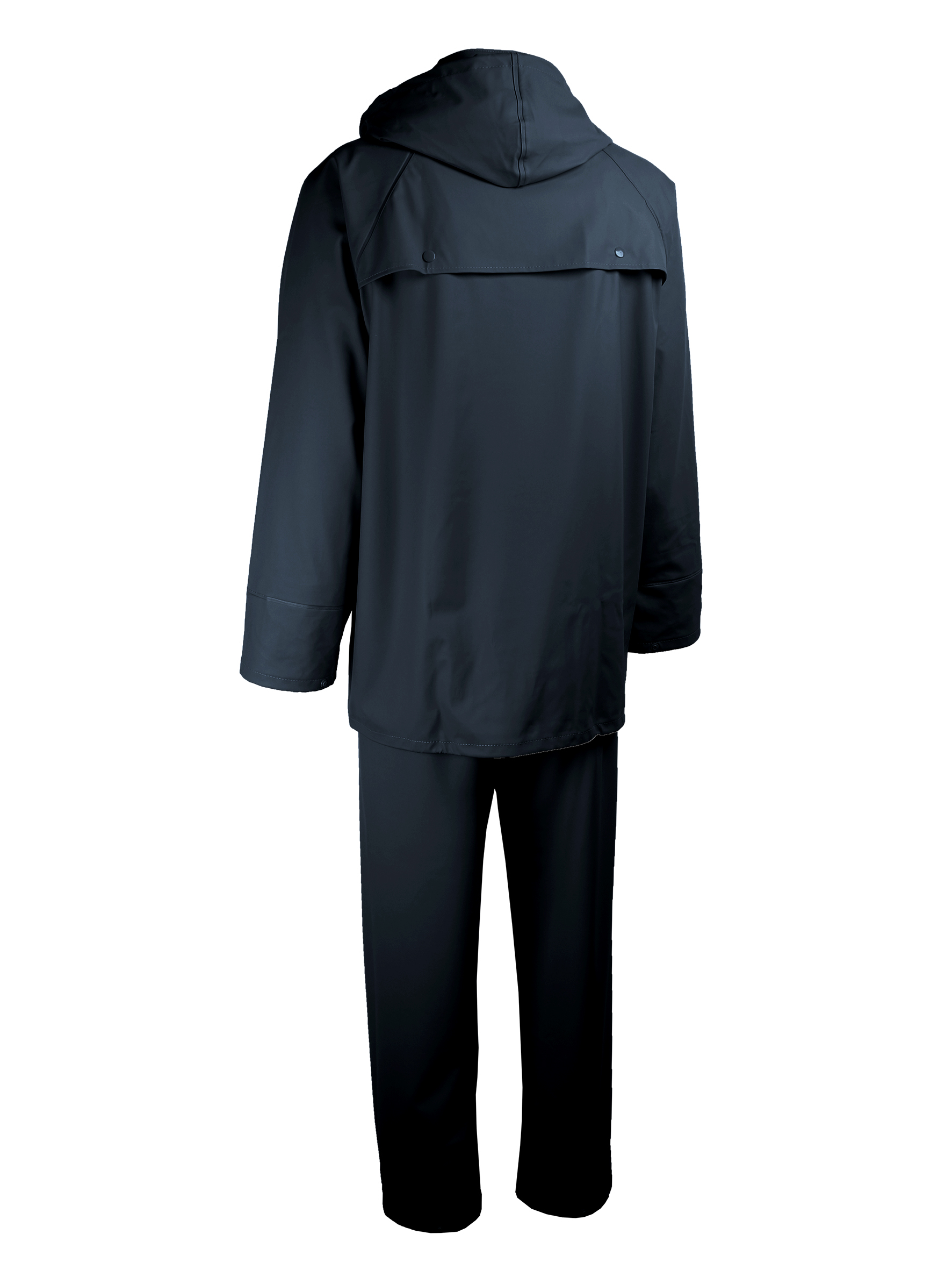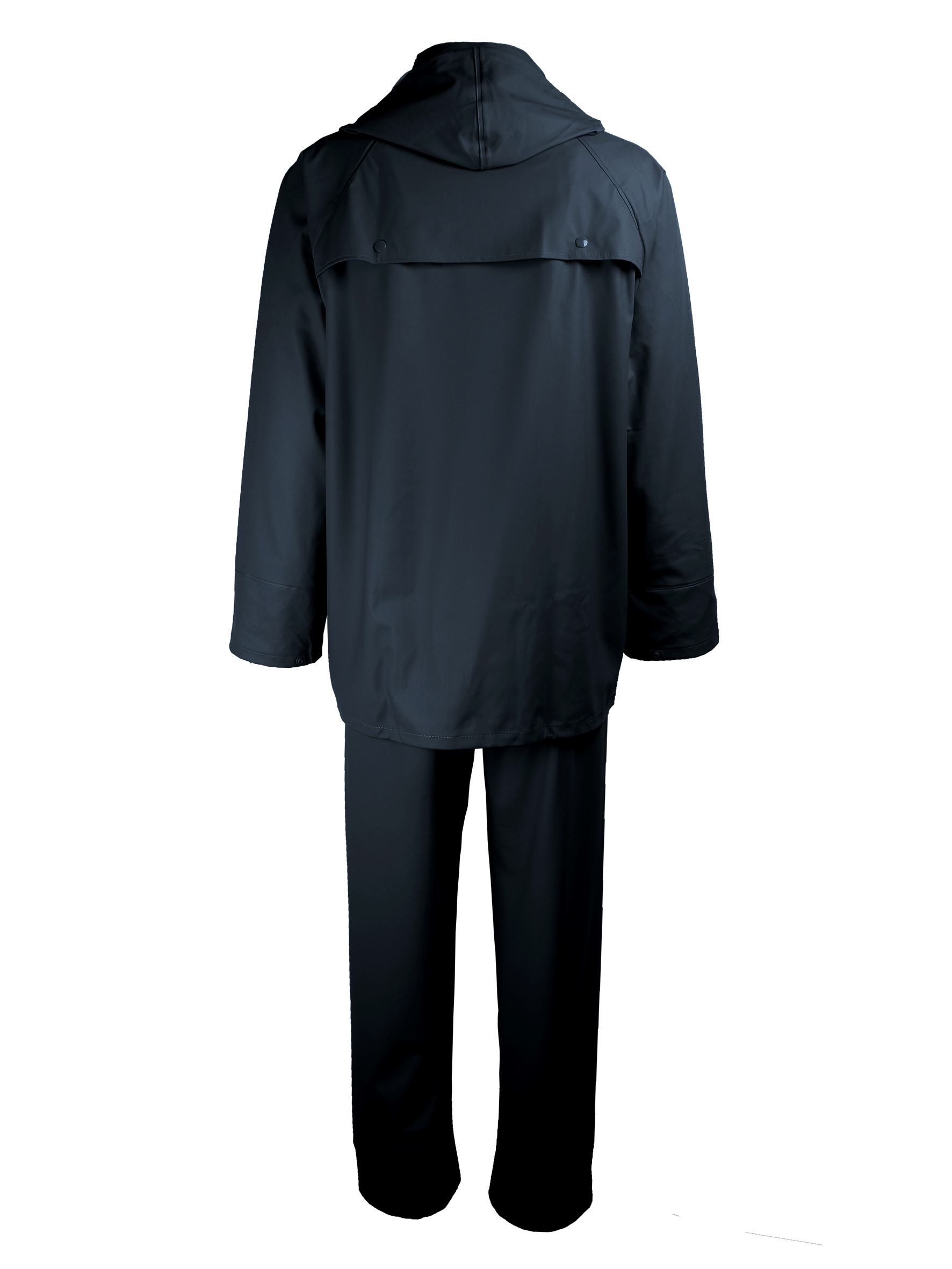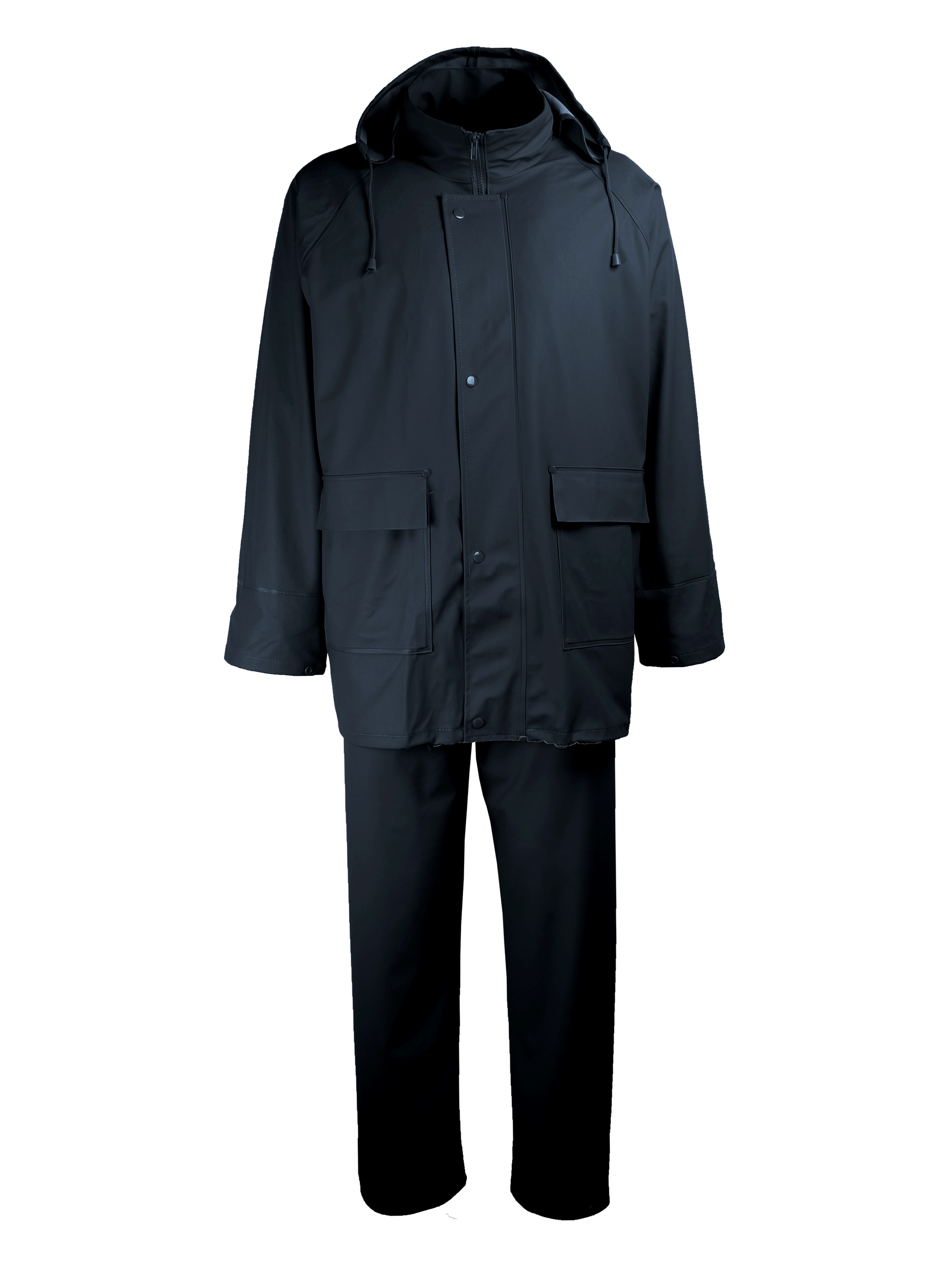 Complet de pluie (veste et pantalon).Polyuréthane/P.V.C sur support polyester. 280 g/m².Veste:* Capuche fixe avec cordon de serrage, enroulable dans le col.* fermeture à glissière sous rabat à pressions. * 2 poches latérales avec rabat.* dos ventilé. * serrage à la taille. Pantalon:* avec braguette et une pression. * cordon de serrage à la taille + serrage élastique. * ajustement en bas des jambes par pressions. * passe-mains.Coutures soudées pour l'imperméabilité.Coloris bleu.
