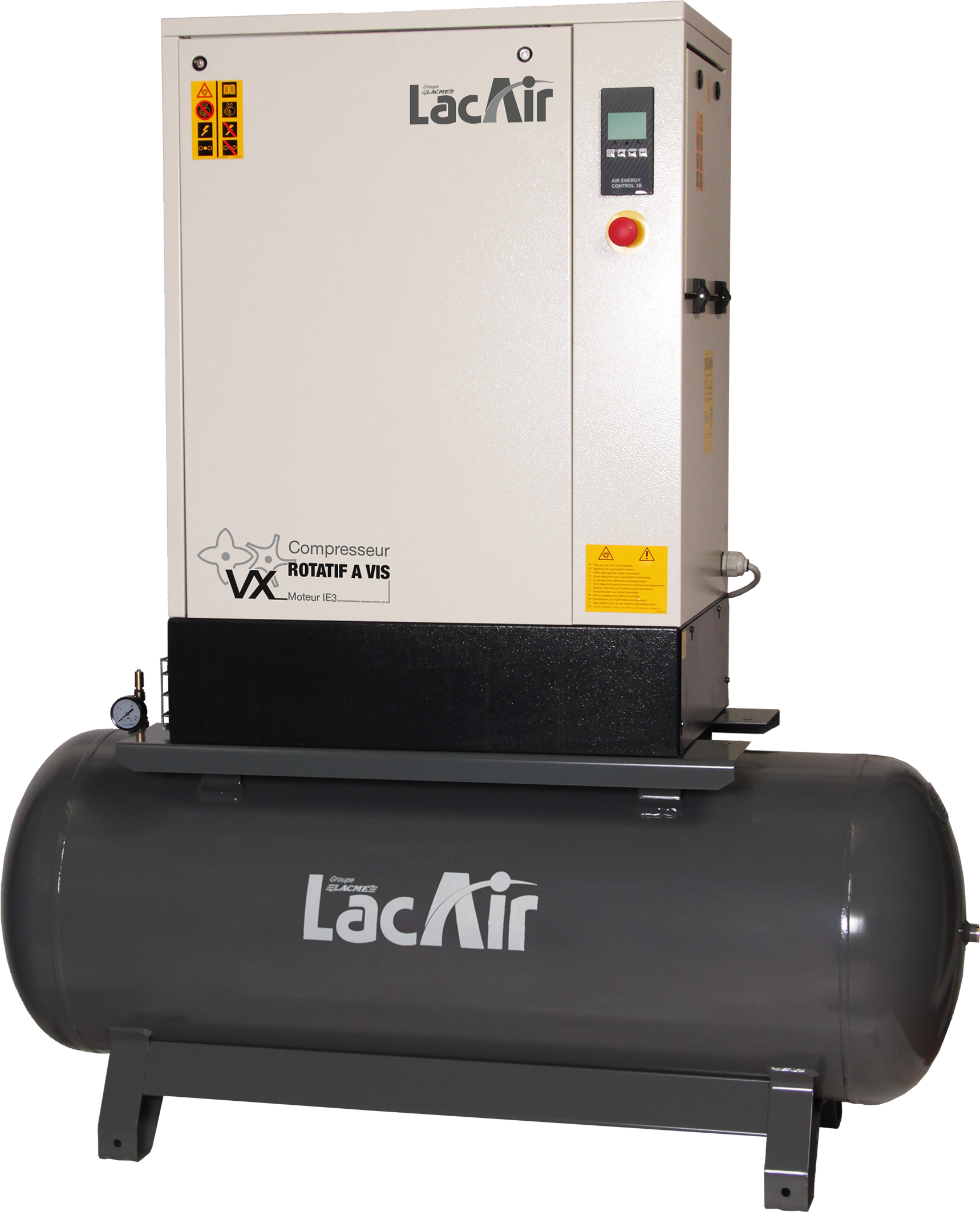 - Equipement standard : Tableau de commande Air Energy Control 3 B Bouton d'arrêt d'urgence Démarrage direct Cordon d'alimentation Cuve horizontale avec longerons Sécheur frigorifique Manomètre pression de cuve Soupape de sécurité (sur cuve)