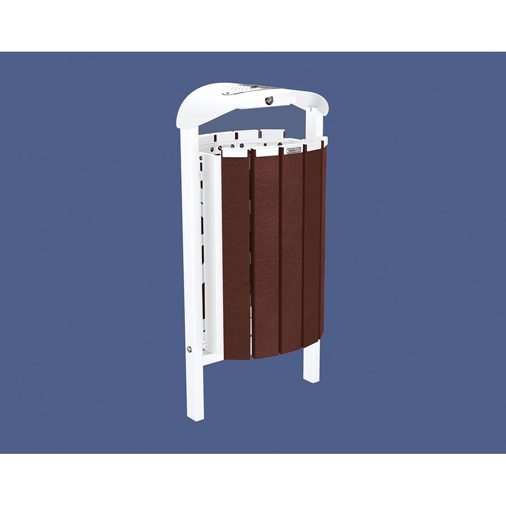 Mesurant 502 mm de longueur, 344 mm de largeur et 953 mm de hauteur, la structure de la corbeille est en plastique recyclé marron de 25 mm d'épaisseur, assurant solidité et respect de l'environnement. Sa finition peinte sur zinc lui confère une esthétique soignée, parfaitement harmonisée avec les bancs Silaos. La corbeille est conçue pour recevoir des sacs de 50 litres, garantissant une grande contenance pour les déchets.