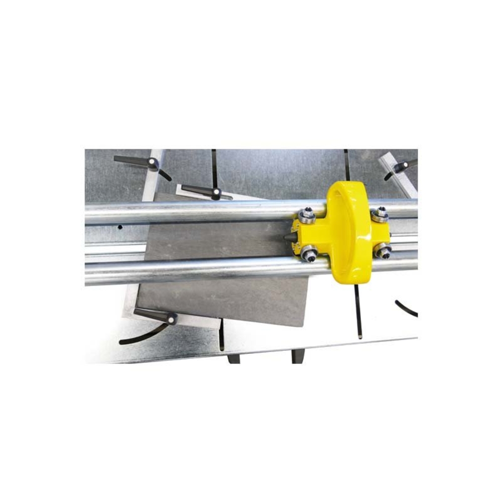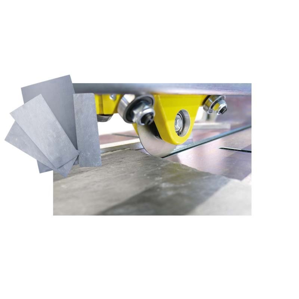 Il dispose d’un disque de coupe renforcé, démontable et interchangeable, parfaitement adapté aux matériaux épais. Le chariot de coupe est guidé par 8 roulements à billes, assurant une excellente régularité de coupe et une manœuvre sans effort. La table de coupe, longue de 885 mm et large de 420 mm, ainsi que le guide sont en acier zingué traité anti-corrosion, garantissant une grande durabilité.