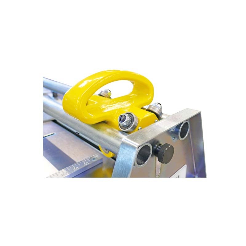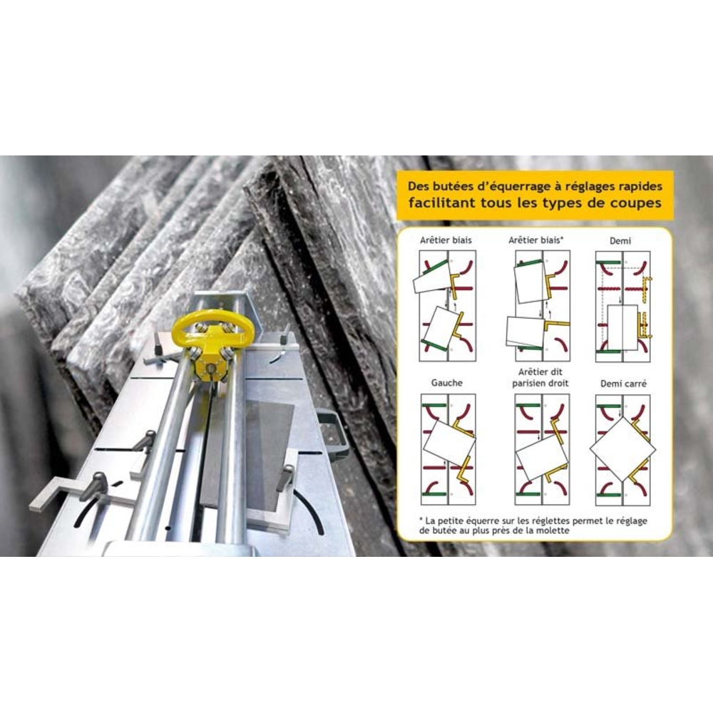 Ce coupe-ardoises s'utilise en positionnant l'ardoise sur le plateau de coupe de 600 mm et en profitant des butées d’équerrage à réglages rapides pour assurer un maintien optimal lors de la découpe. Grâce à son chariot guidé par 8 roulements, il permet d’effectuer des coupes en série avec une grande facilité.