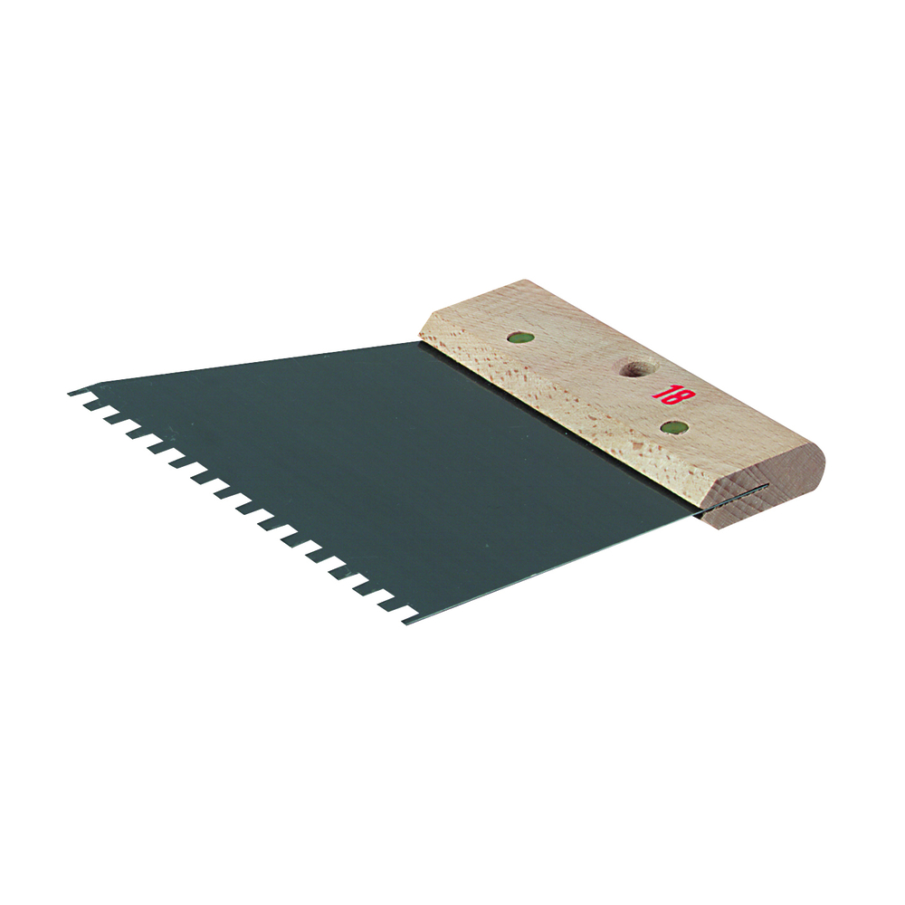 Ce couteau à colle est conçu pour faciliter l'application de colles sur des surfaces murales nécessitant une adhérence optimale. Sa lame en acier trempé verni assure une durabilité et une résistance à la corrosion, tandis que son manche en bois brut garantit une prise en main confortable et ergonomique. Avec des dents carrées de 6 x 6 mm, il est parfait pour manipuler des revêtements allant jusqu'à 3000 g/m².